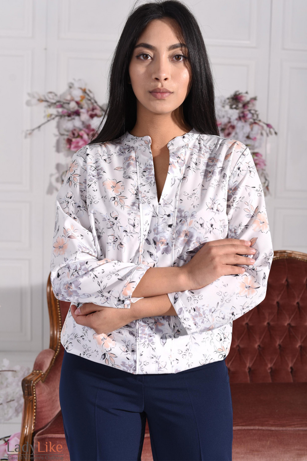 Женская белая блузка в принт цветок. С V-образным вырезом и рукавом три четверти. Материал - софт.