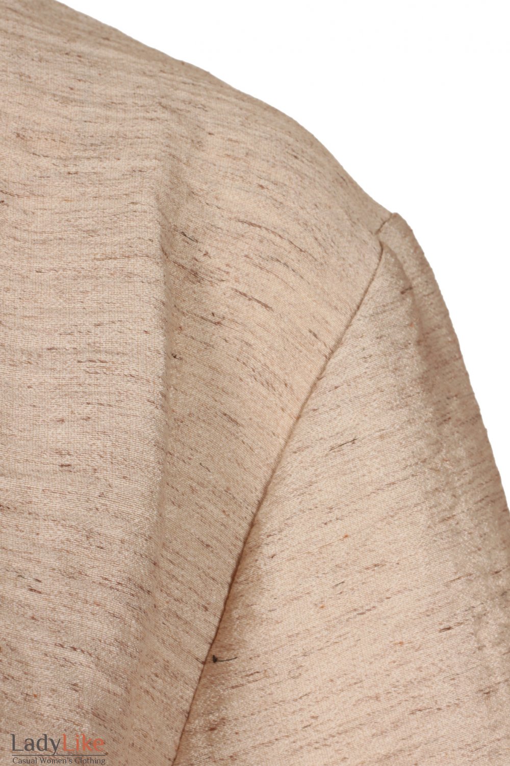 Блузка оверсайз бежевого цвета. Прямая, воротник стояче отложной, впереди застегивается на пуговицы. Рукава широкие, три четверти с манжетой. С левой стороны на полочке широкий клапан-обманка. Низ блузки закруглен. Длина 71 см.