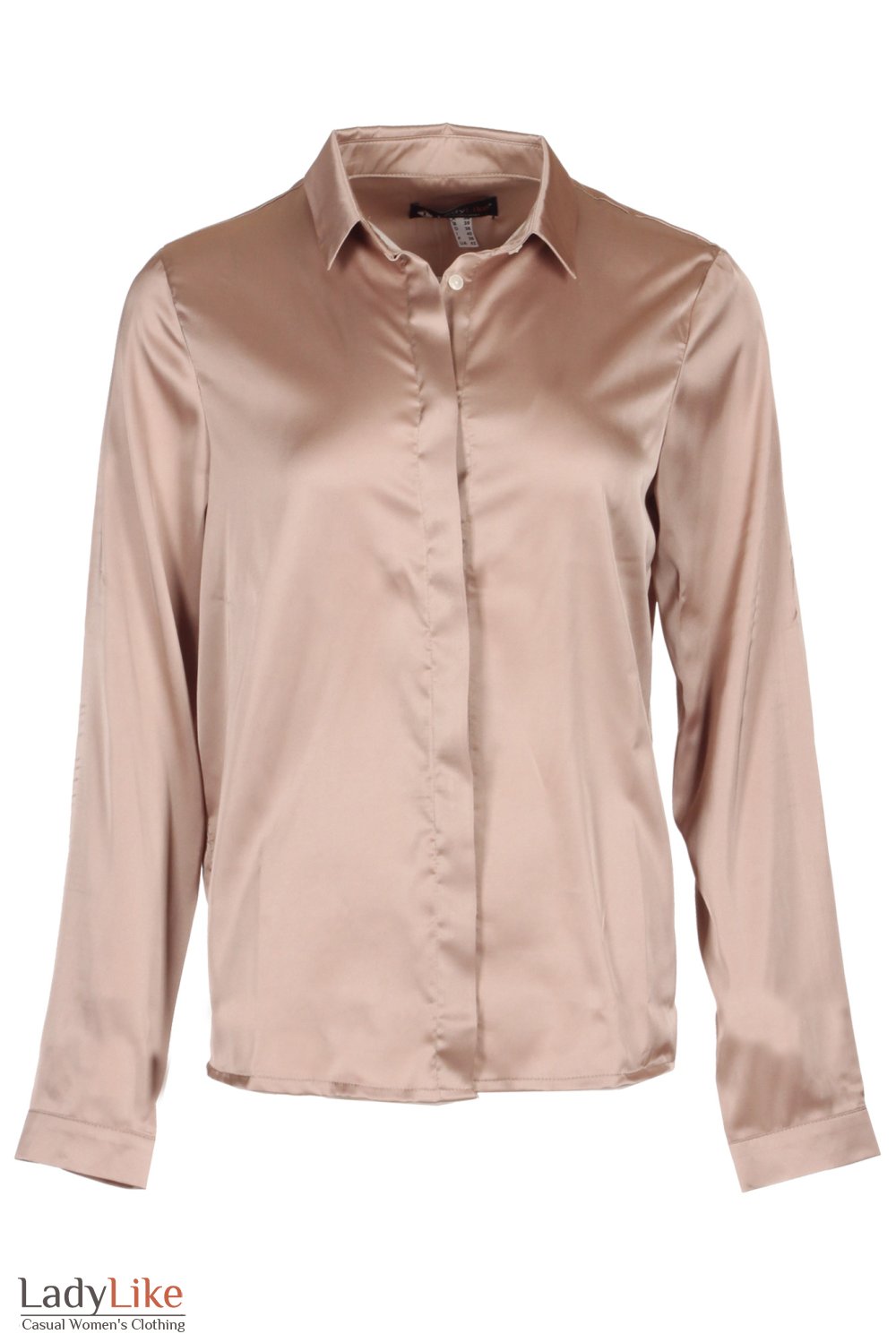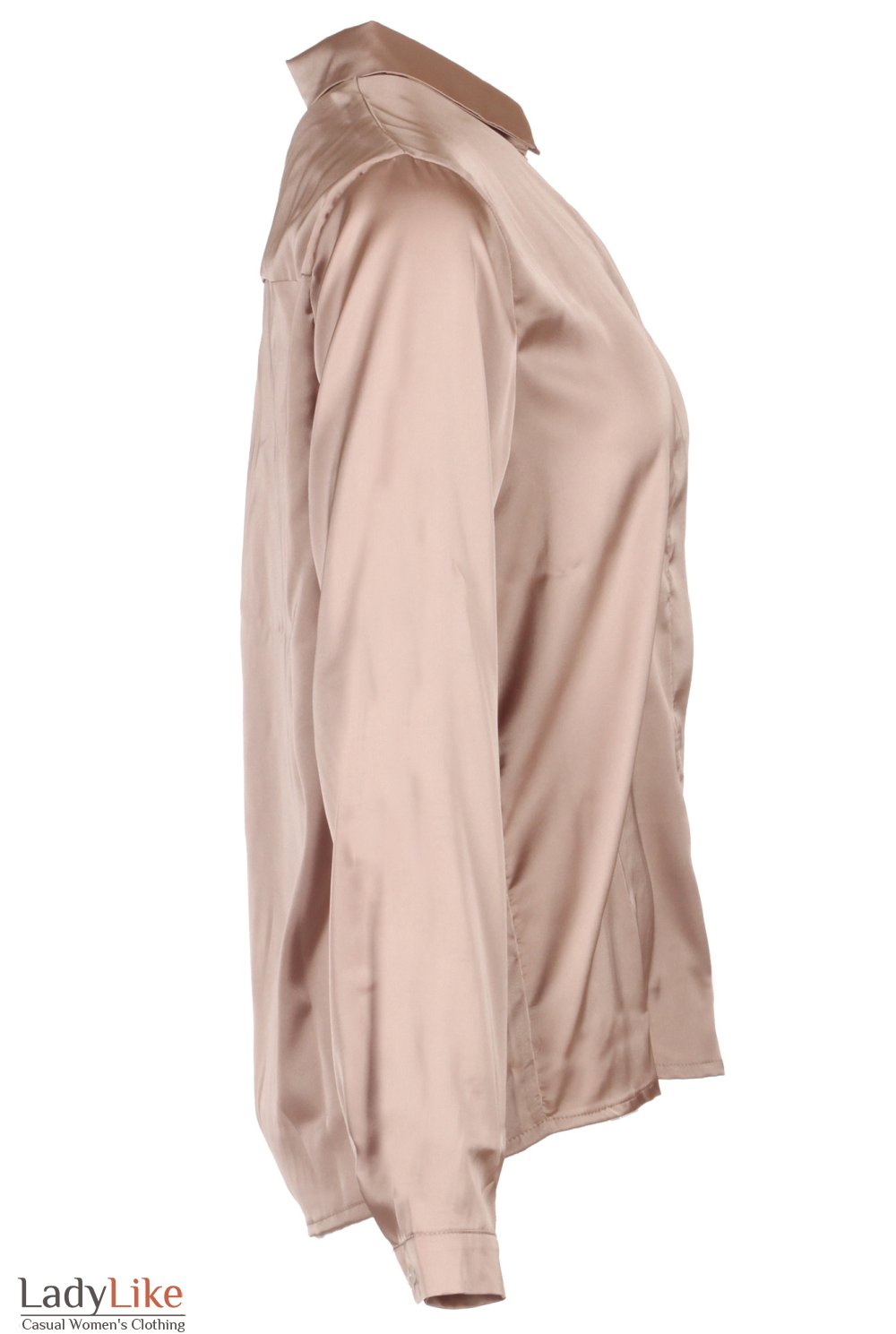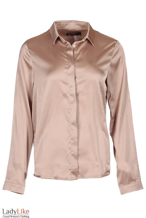 Блузка шелковая, темно-бежевого цвета. Прямая, свободная, воротник стояче-отложной. Потайная застежка на пуговицы по планке. По спинке кокетка со встречной складкой. Рукава длинные с манжетой. Длина 58 см.
