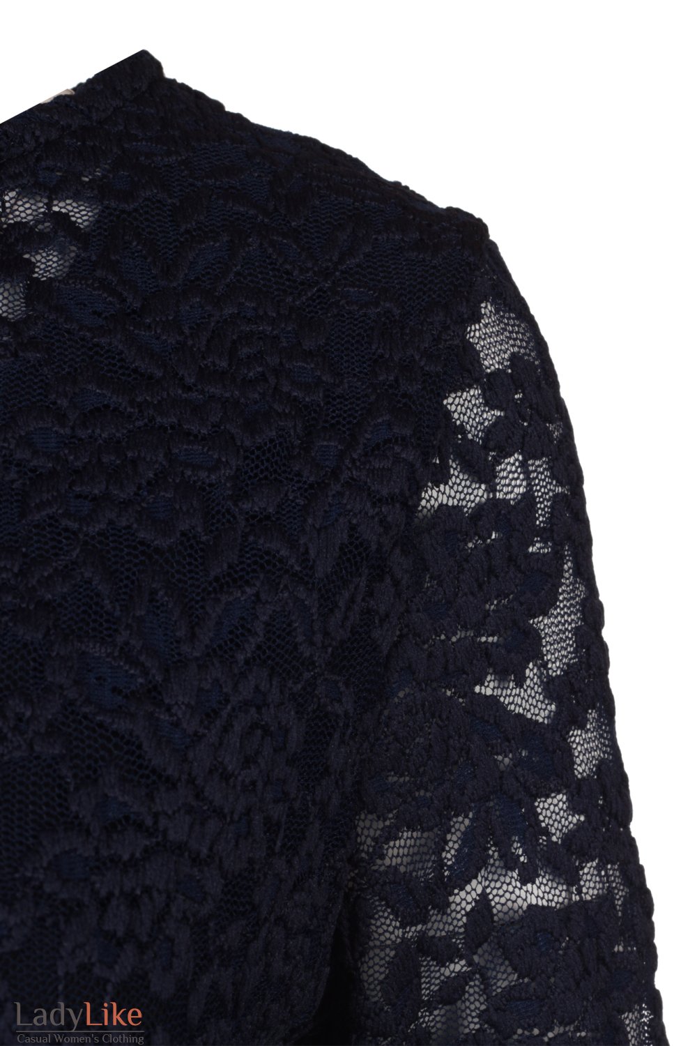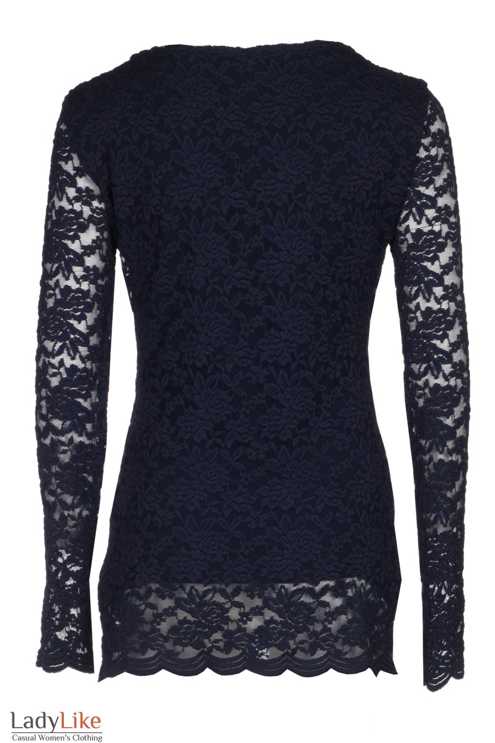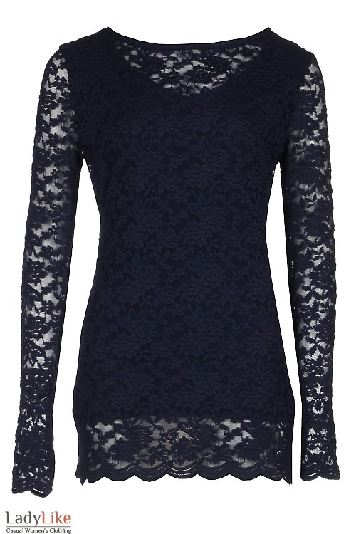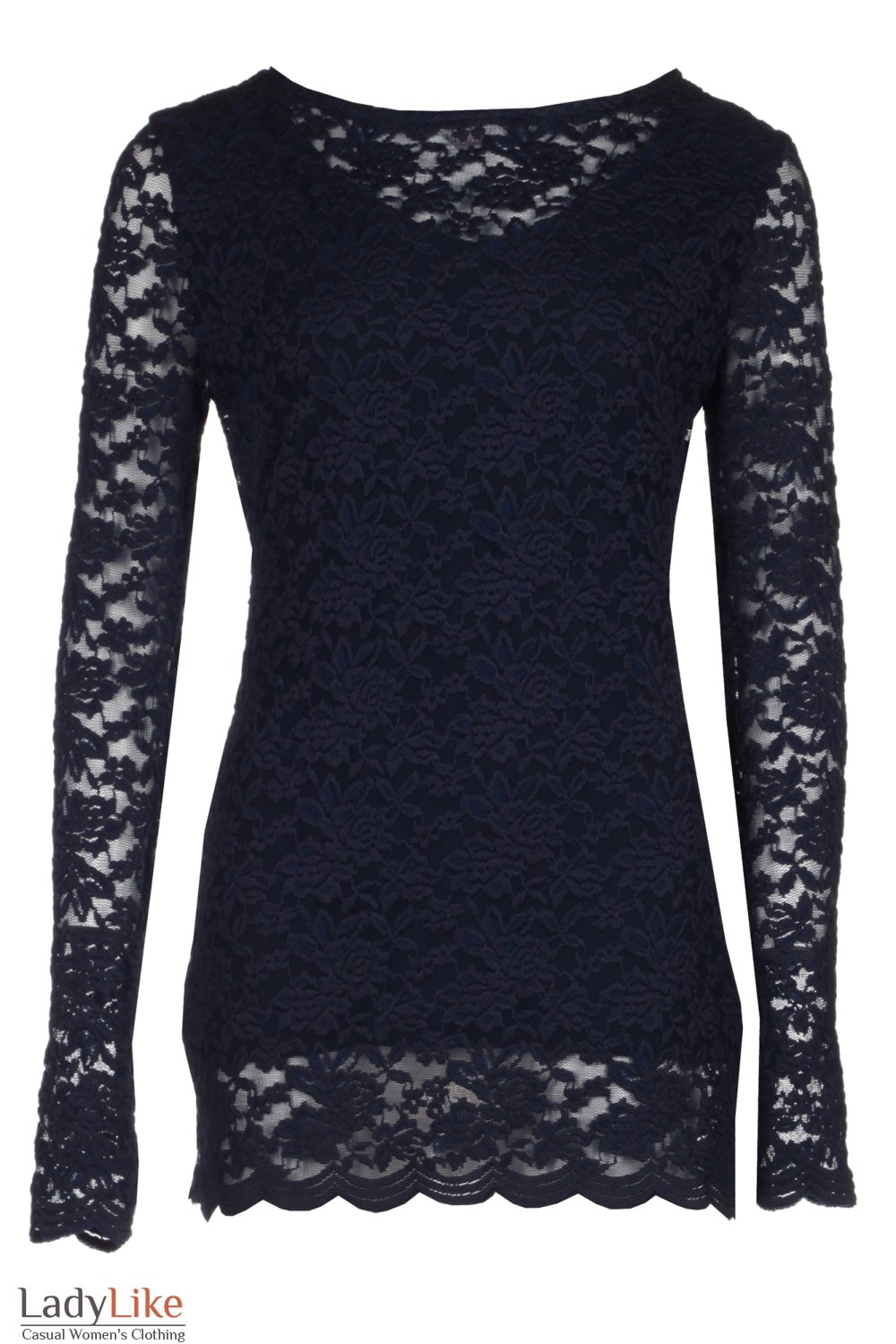 Блузка в стиле лонгслив, комбинация двух тканей, основной синий трикотаж с гипюром синего цвета. Прямая, слегка приталенная, круглый вырез горловины. Рукава гипюровые длинные. Длина 72 см.