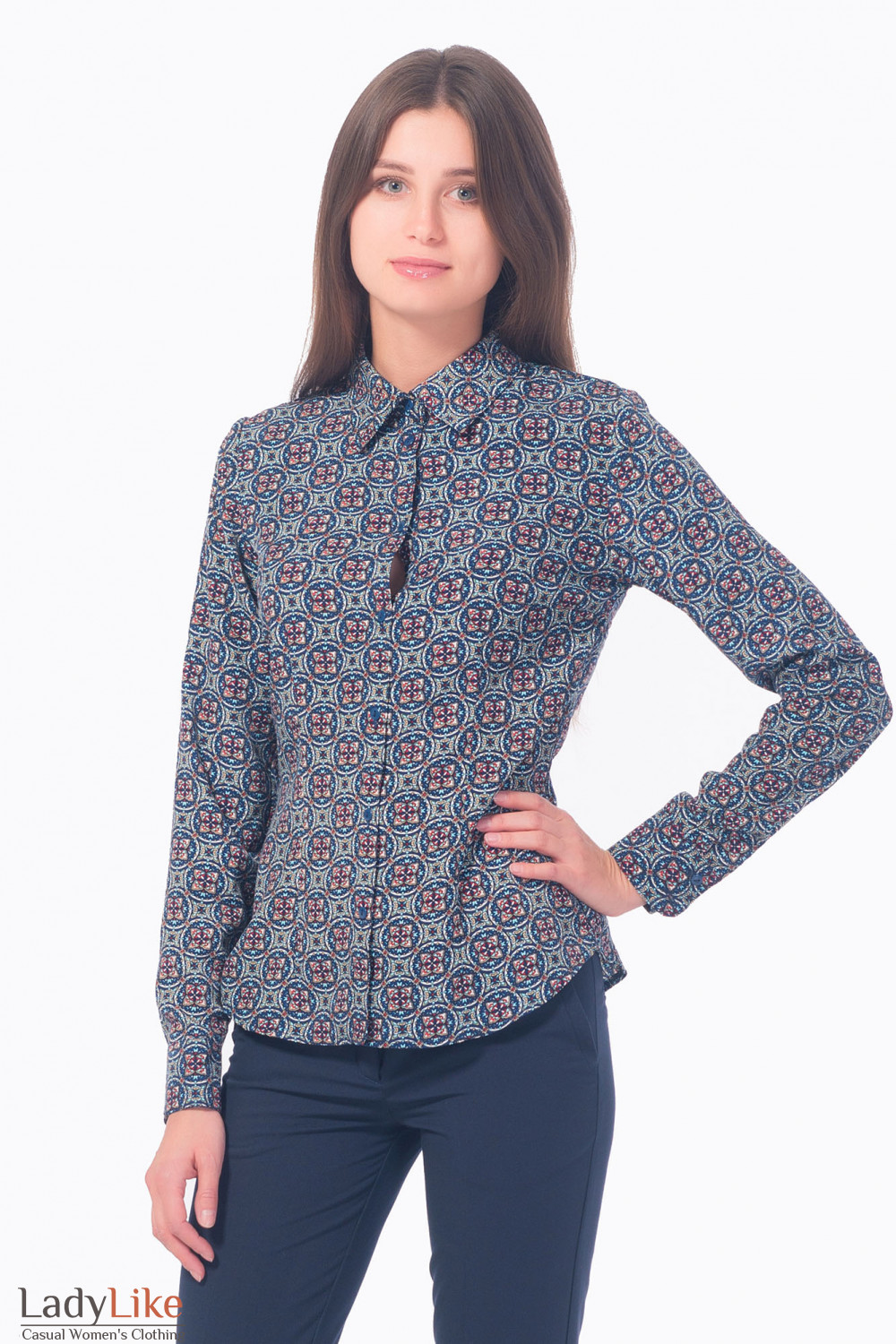 Классическая рубашка синего цвета в красный узор, приталенного кроя. На полочке и спинке выточки. Воротник - стояче-отложной. Длинный рукав с манжетой. Длина изделия ок. 58 см