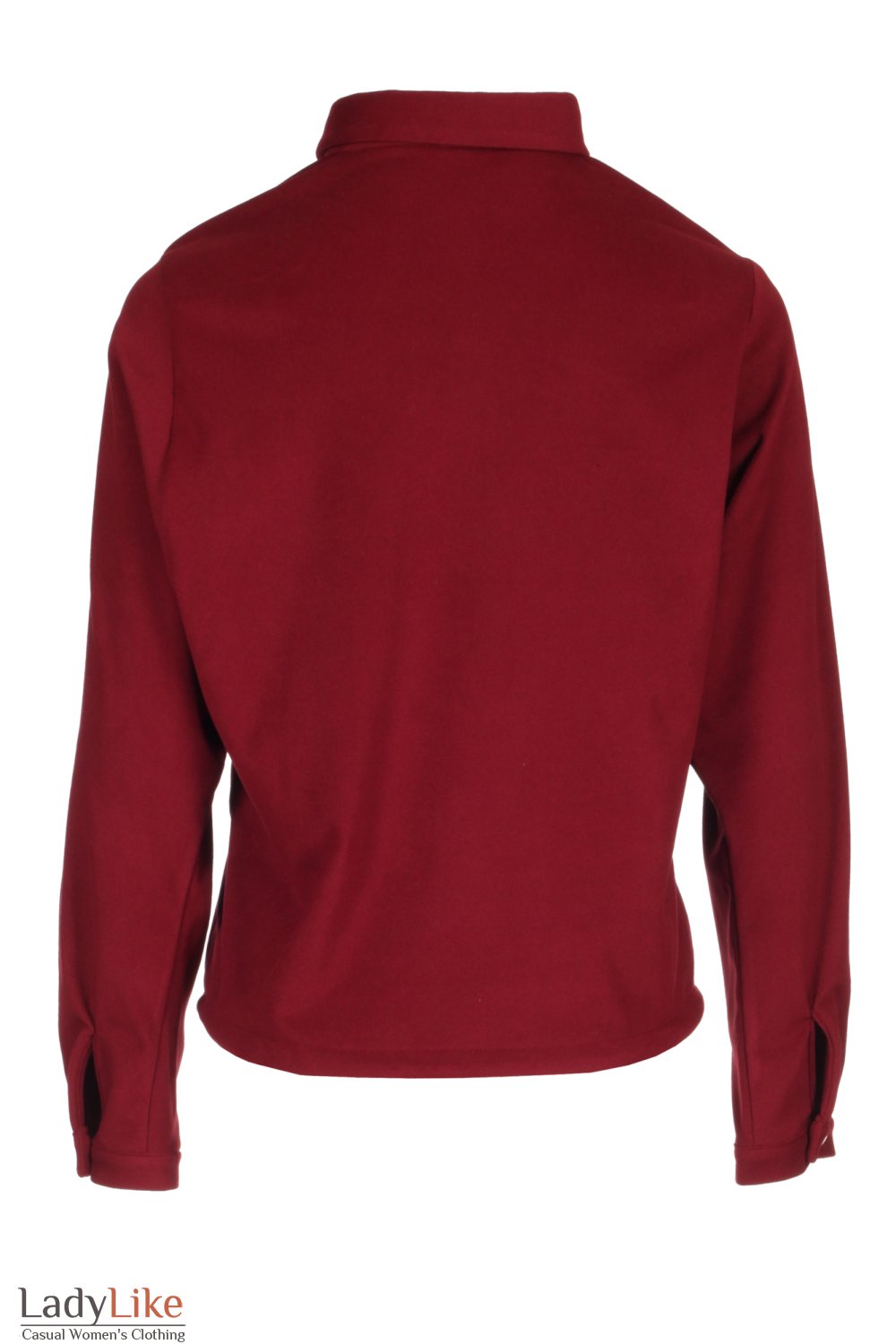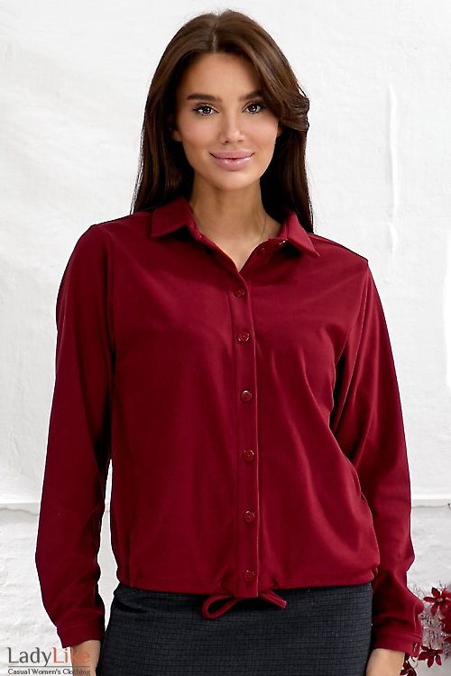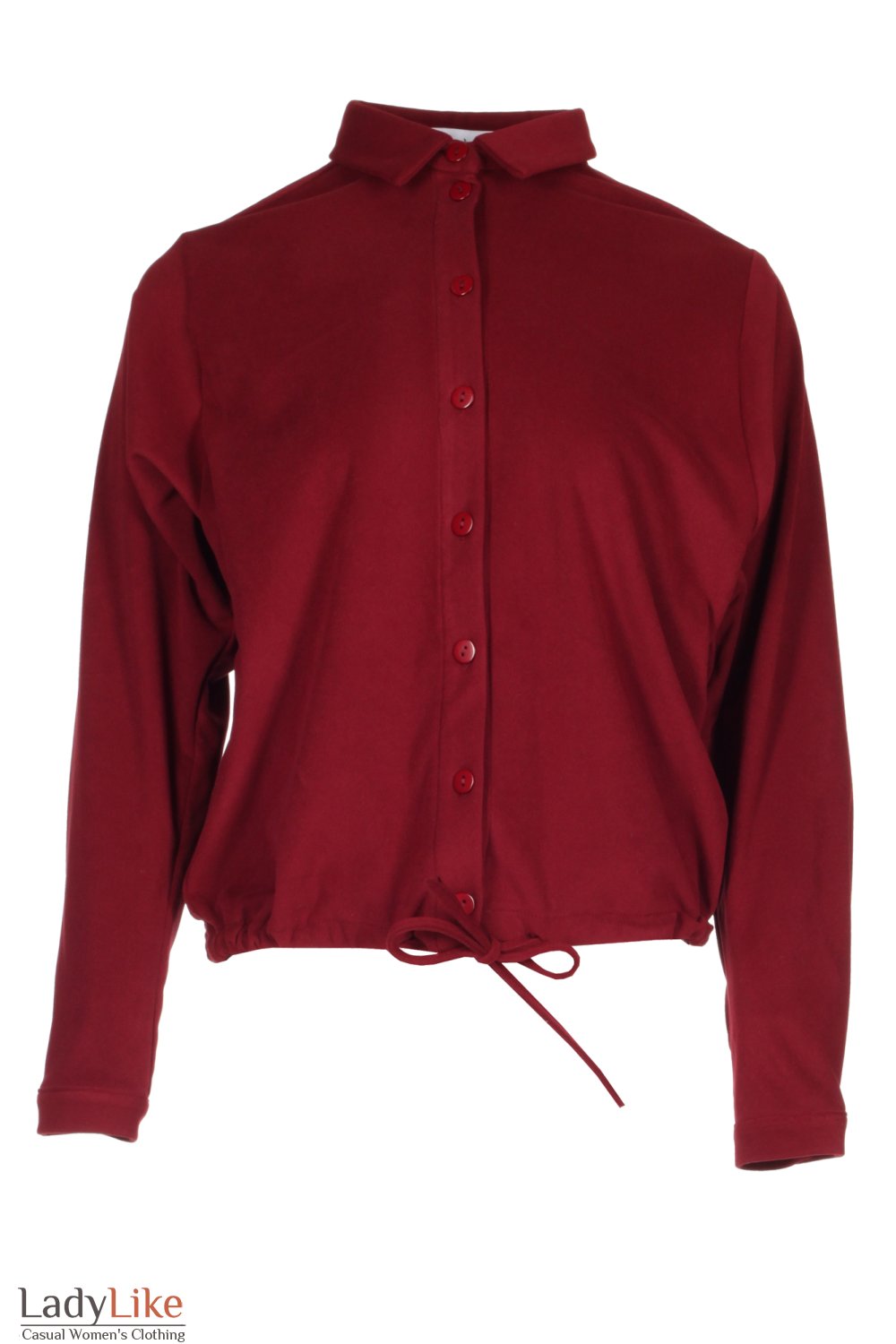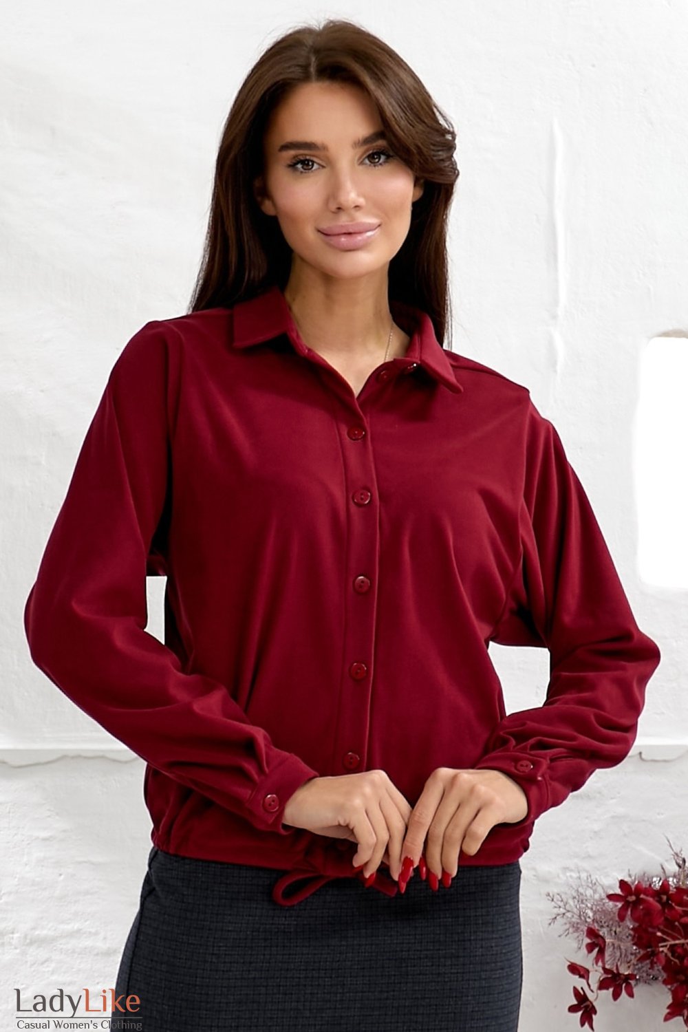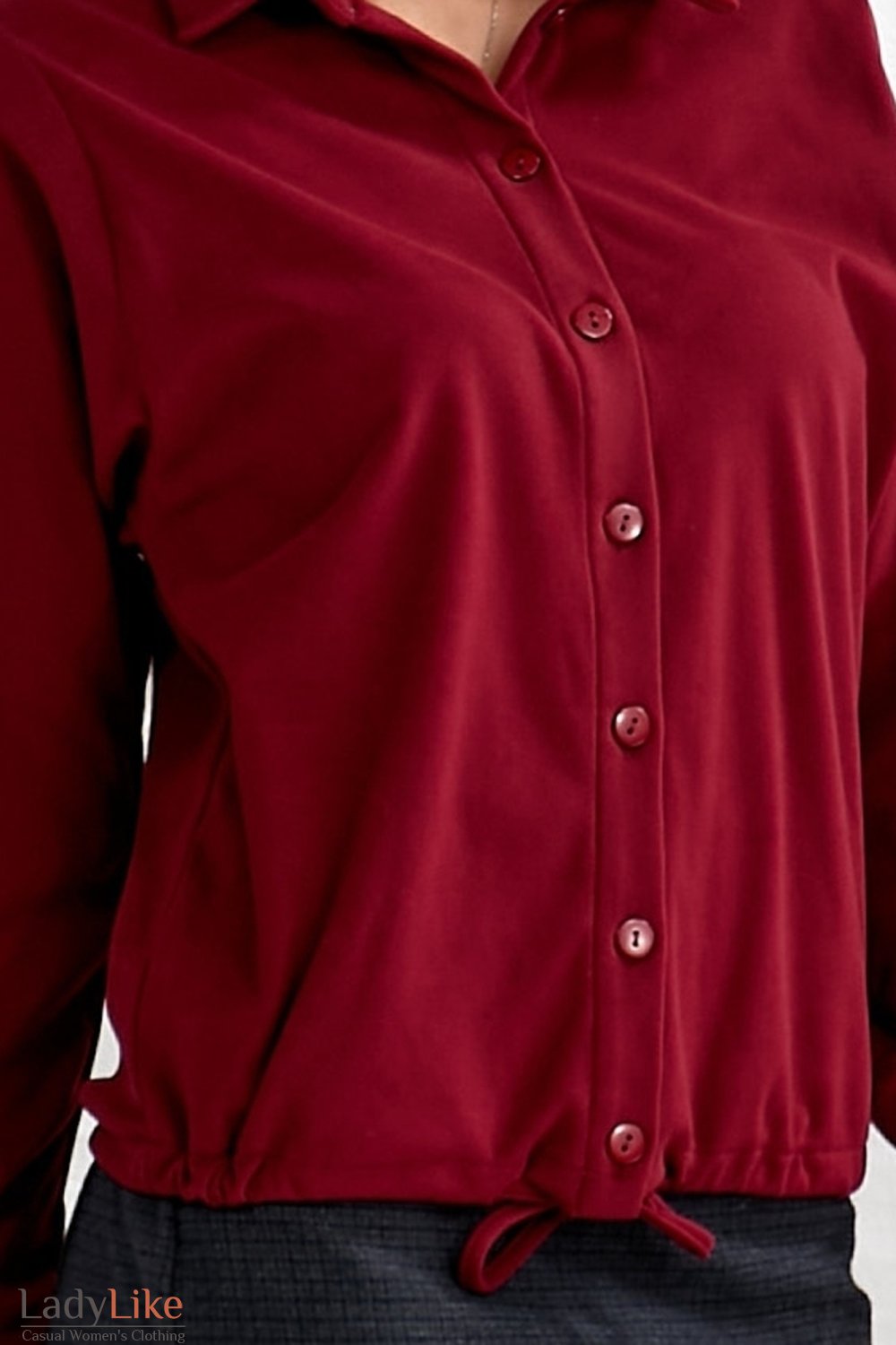Блузка трикотаж флисовый в бордового цвета. Прямая, воротник стояче отложной, впереди застегивается на пуговицы. Рукава длинные с тонкими манжетами на одну пуговицу. Вниз блузки вставлена кулиса. Длина 60 см.