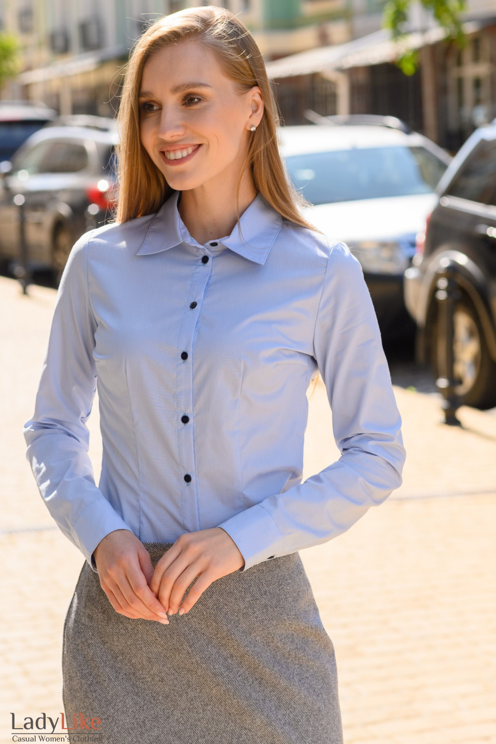 Классическая женская голубая рубашка. Просторного кроя. Отложной воротник и застежка на пуговицы. Длинный рукав с тонкой манжетой. Прекрасно подойдет и под юбки, и под брюки.