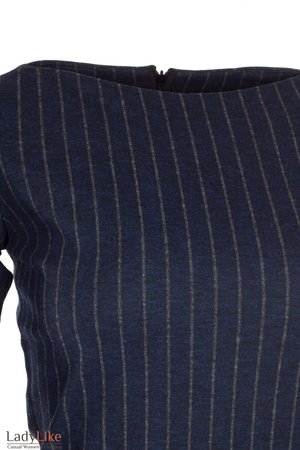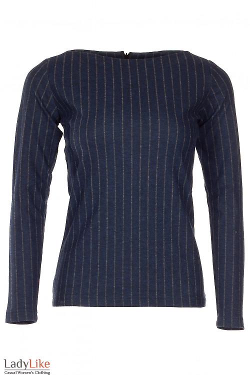 Теплая женская туника темно-синяя в серую полоску. Приталенная , сзади застегивается на потайную молнию. Узкий длинный рукав. Вырез горловины лодочка.
