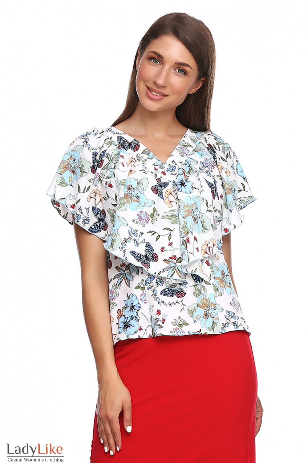 Летняя белая блузка в голубые цветы. V-образный вырез горловины. Приталенный крой. Верх блузки украшен широкой пелериной, которая прикрывает плечи. Длина блузки ок. 60 см.