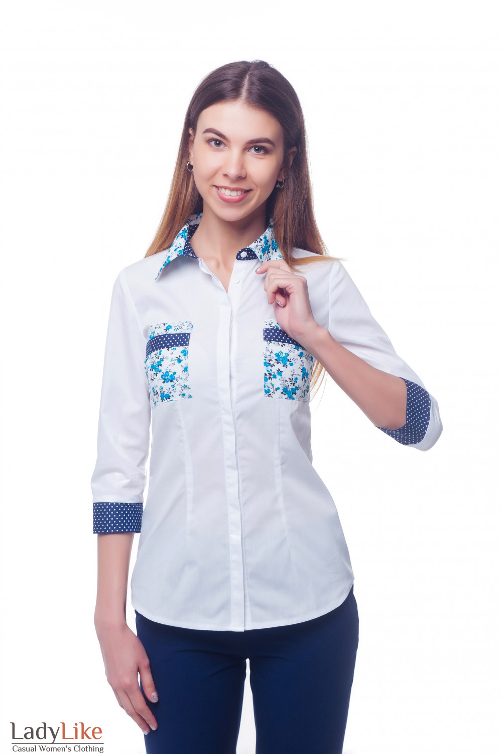 Классическая белая рубашка приталенного кроя. На полочке и спинке выточки. На груди блузка украшена карманами. Воротник - стояче-отложной. Рукав с манжетой в горошек. Длина изделия ок. 58 см