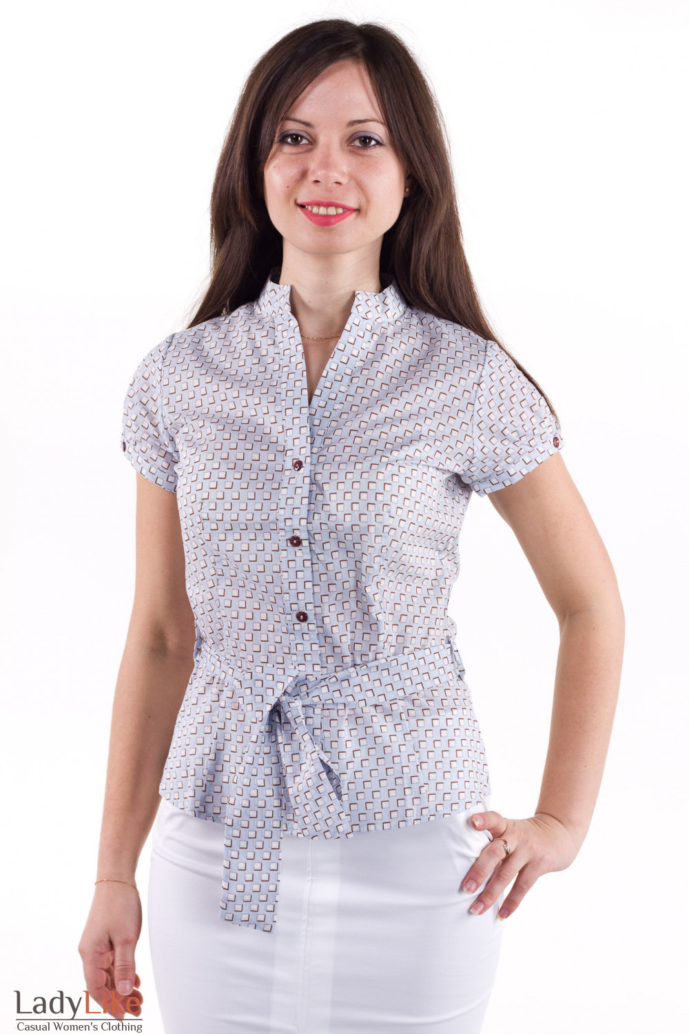 Блузка голубая в коричневые квадратики