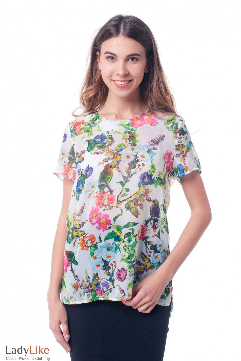 Летняя шифоновая футболка в зеленые цветы. Круглый вырез гороловины, просторный крой. Короткий рукавчик. Сзади украшена планкой с пуговицами. Длина по спинке окколо 63 см.