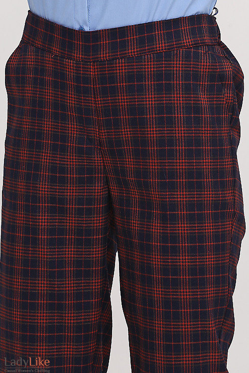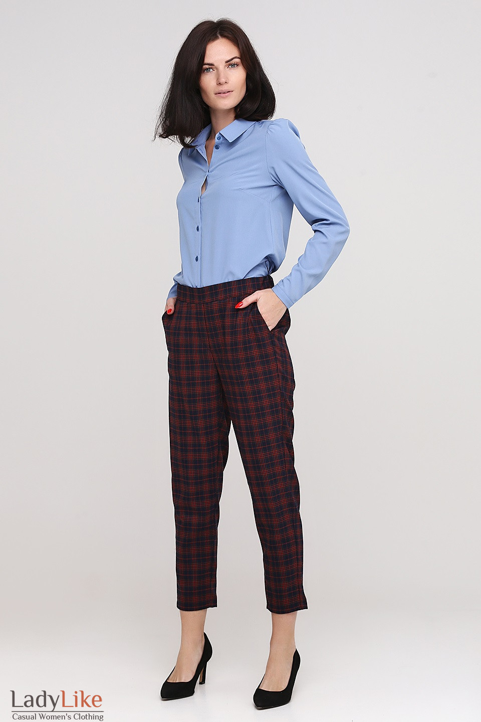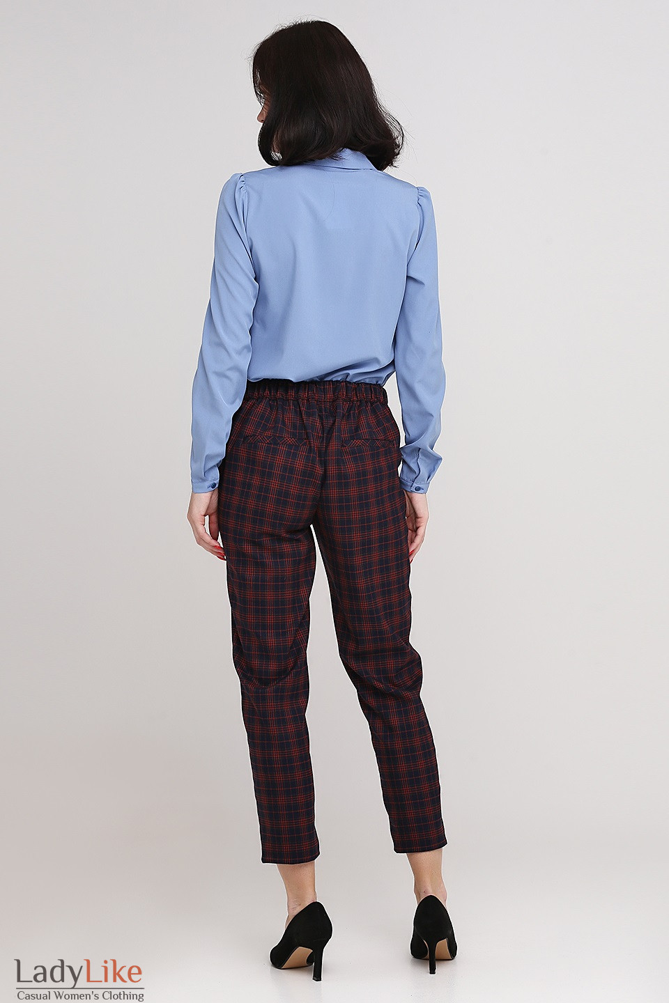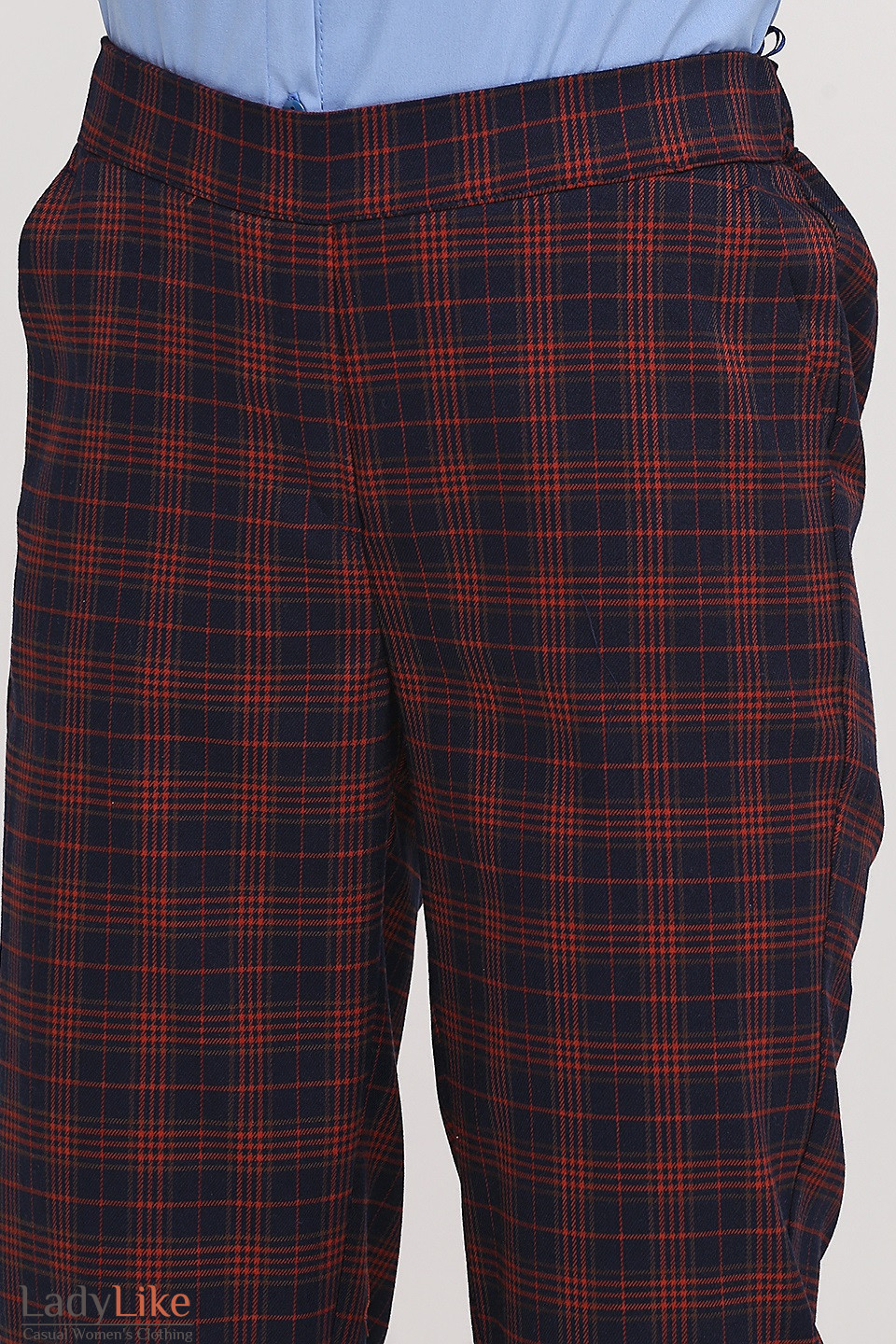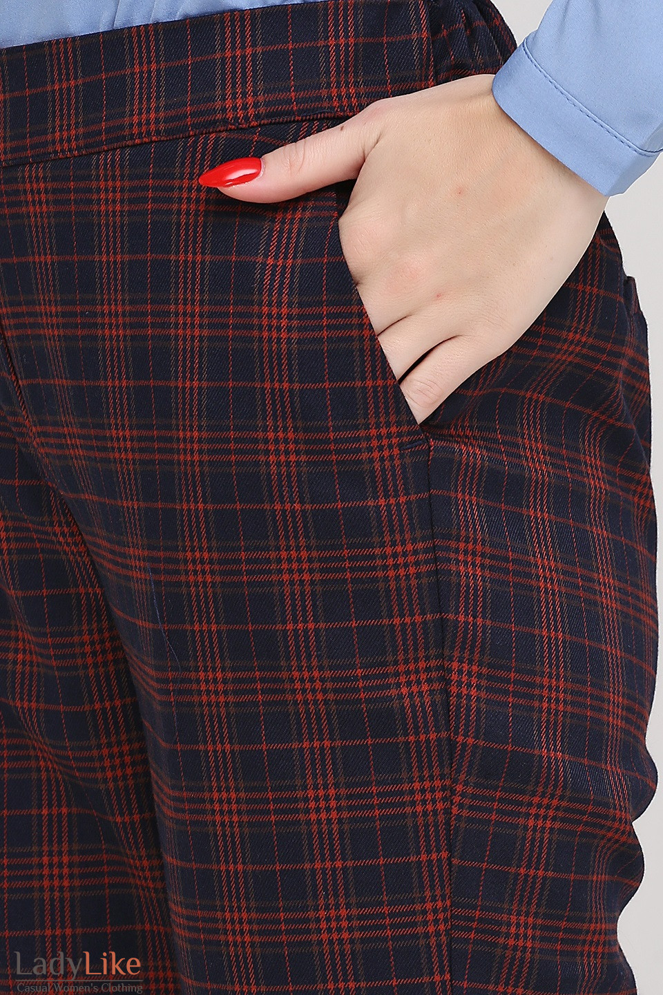 Теплые синие брюки в клетку. Удобная высокая посадка. Спереди прорезные карманы, сзади карманы-обманки. Пояс на резинке. Зауженная модель брюк с длиной 7/8.