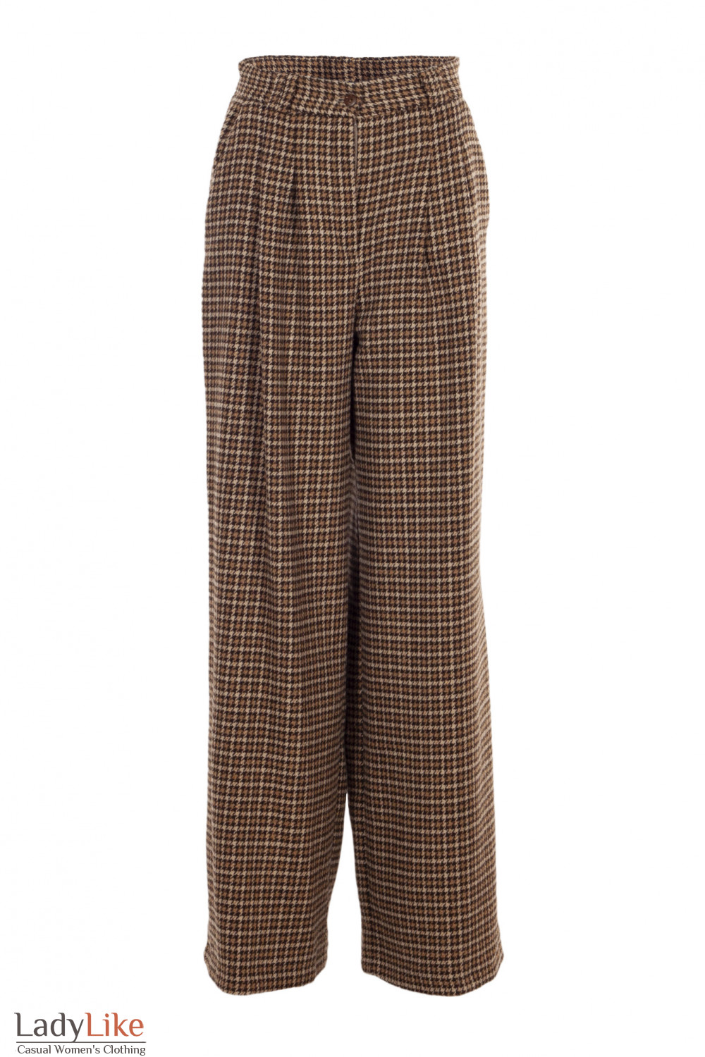 Брюки палаццо в коричнево-бежевую лапку. Просторный крой с высокой посадкой в талии. Верх брючин украшен несколькими защипами. По бокам добавлены прорезные карманы. Стильные теплые брюки.
