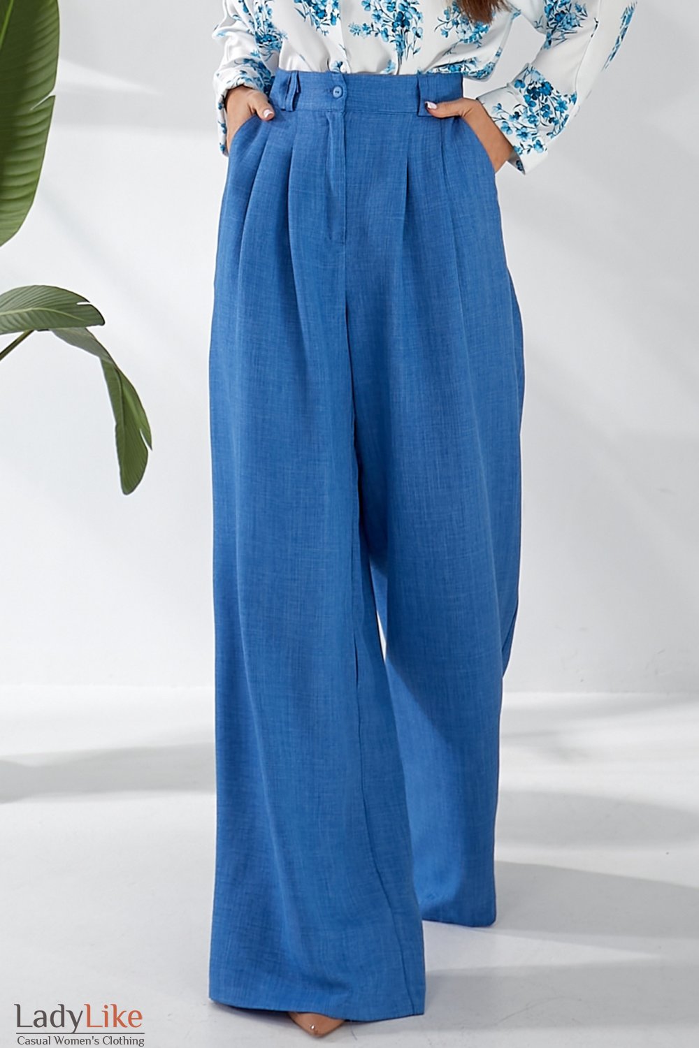 Брюки синие льняные палаццо с защипами