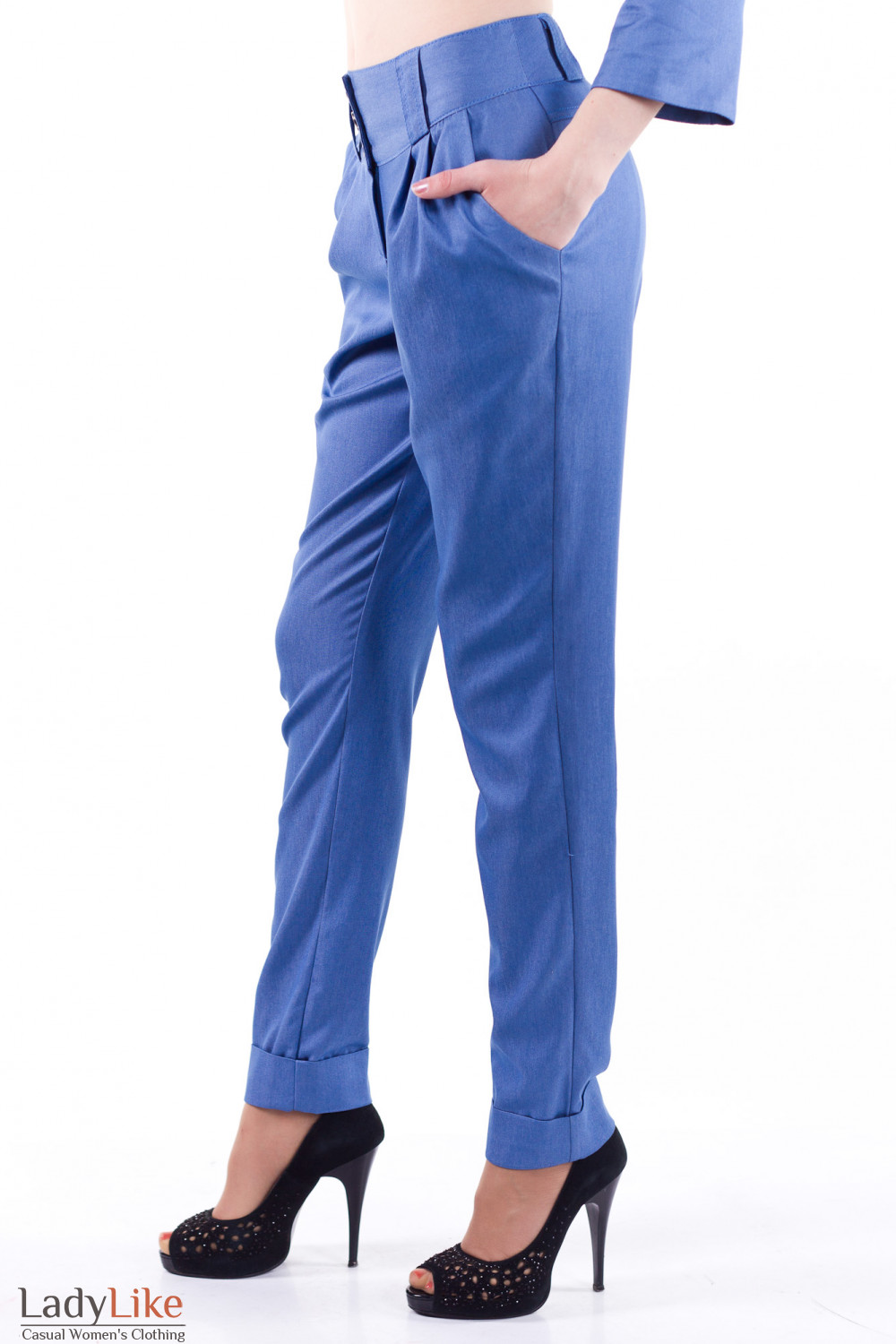 Брюки из легкой ткани цвета под синий джинс. Спереди с защипами в виде галифе. По бокам прорезные карманы. Брюки заужены, по низу украшены манжетой. Застежка по переду на три пуговицы с петлями и молнию. Длина около 90 см. Состав: 53% вискоза, 10% хлопок, 35% полиэстер, 2% эластан.