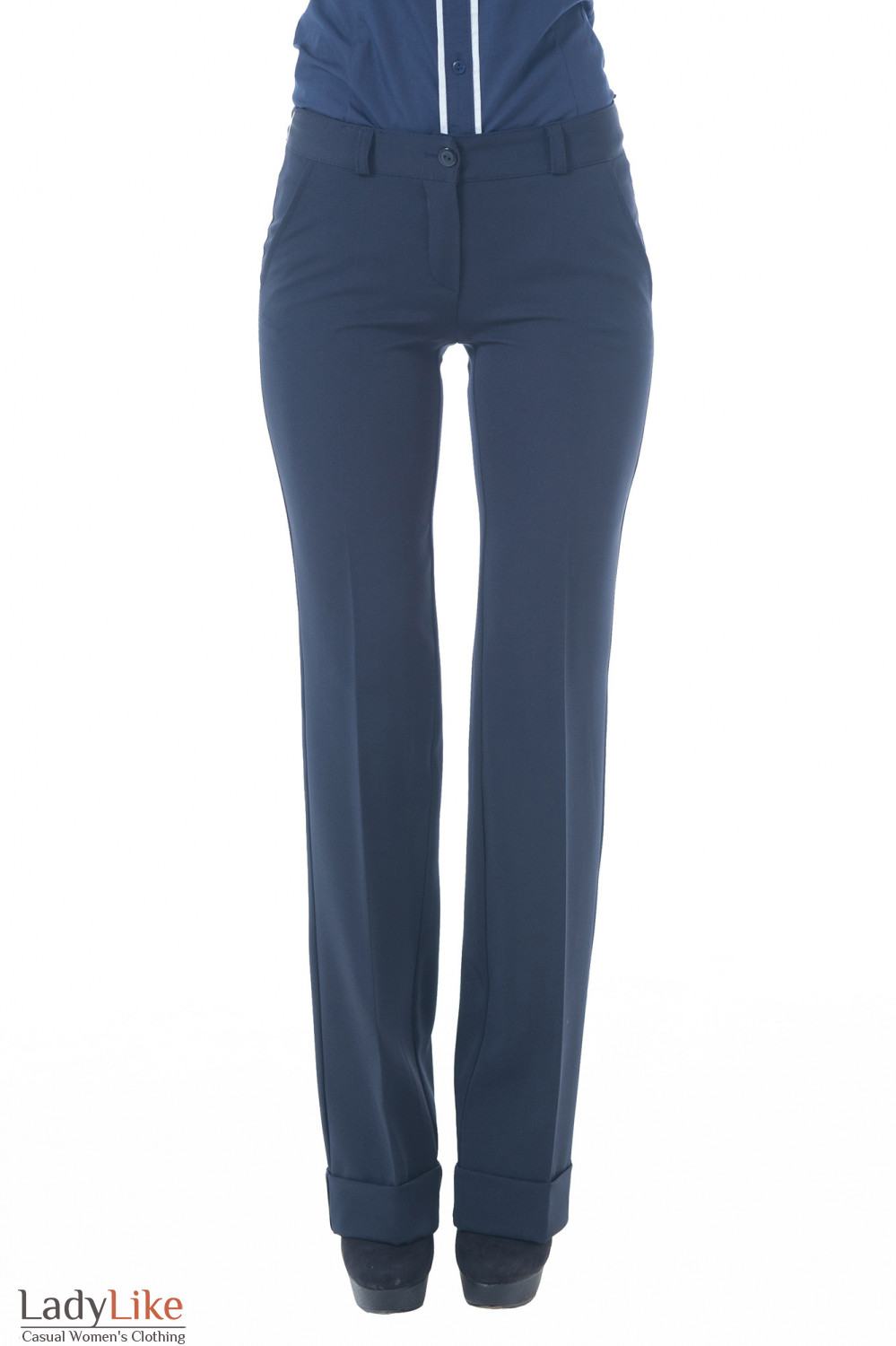 Темно-синее женские брюки со стрелками. Удобная средняя посадка. Застегивется на молнию, пуговицу и петлю. Пояс со шлевками под ремень. Впереди два прорезных кармана-хулигана. Брюки слегка расклешенны от бедра. Низ брюк украшен манжетой. Длина ок. 82 см.