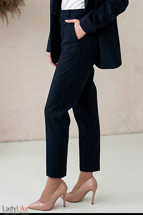 Женские теплые брюки с высокой посадкой. В цвете маренго (синий:серый) Зауженные к низу. Спереди прорезные карманы, сзади карманы-обманки. На поясе шлевки для ремня. Застегиваются на молнию и пуговицу.