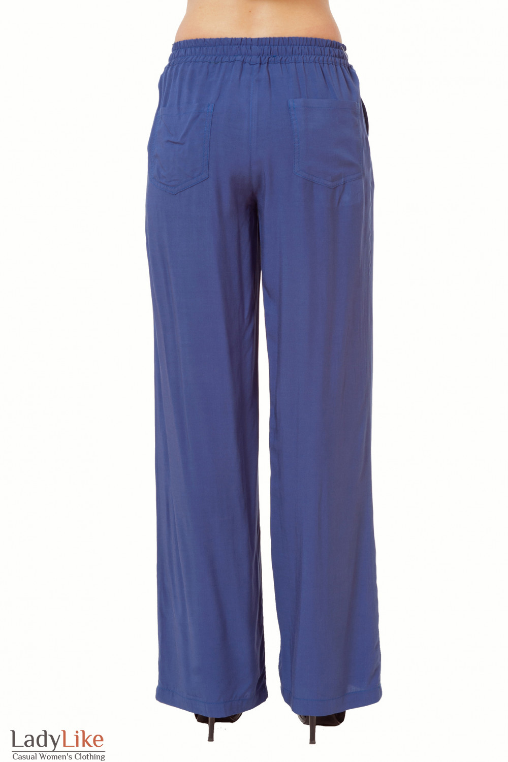 Брюки синие из тонкого штапеля, прямые от бедра. Широкий пояс с резинкой и кулиской. По бокам прорезные карманы. Сзади накладные карманы. Длина ок 76 см.