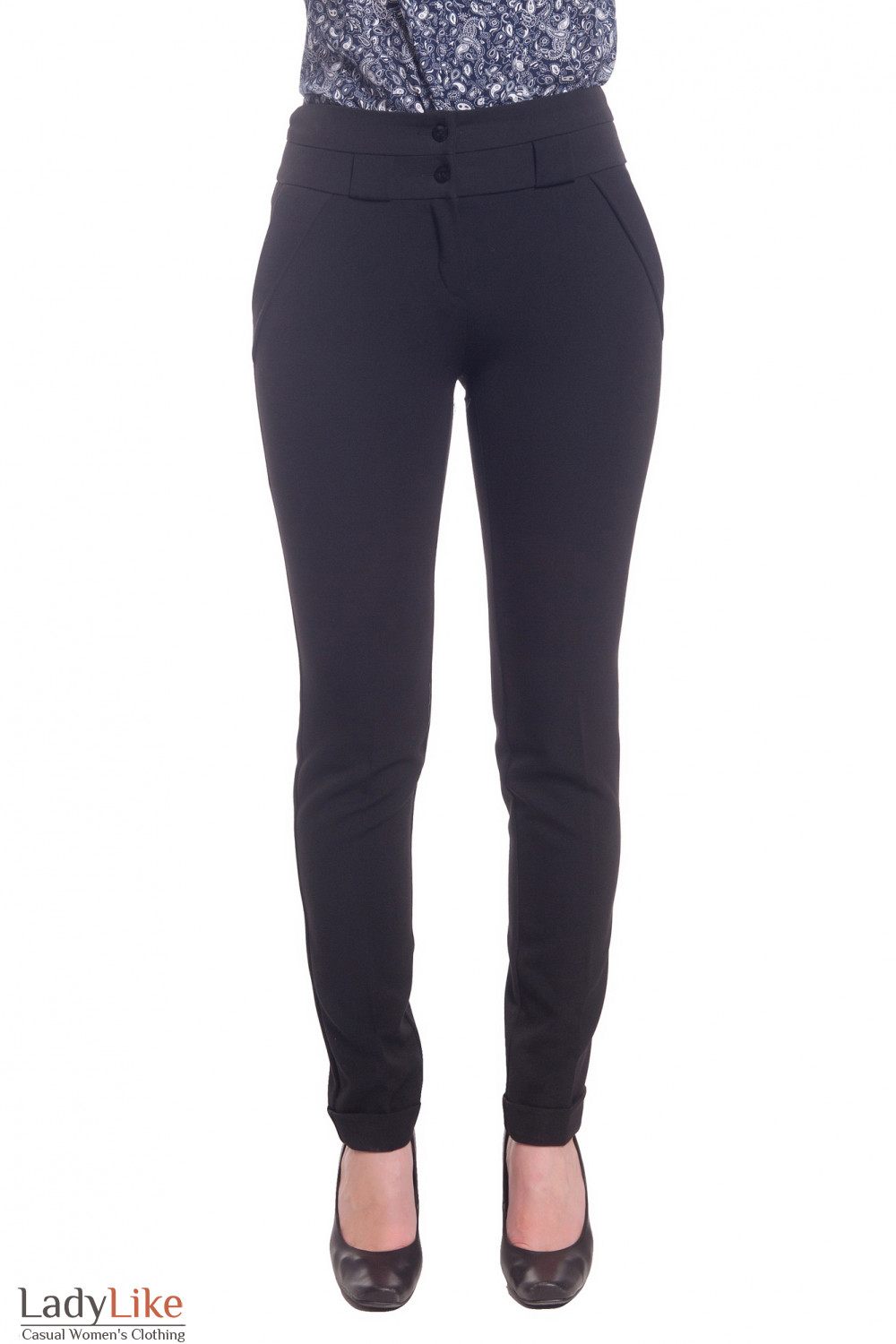 Черные теплые женские брюки, зауженные к низу. Под широким поясом - кокетки. На поясе шлевки (петли) для ремня. По бокам прорезные карманы с клапанами. Застегиваются на молнию и две пуговицы. Длина ок 80 см.