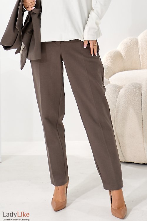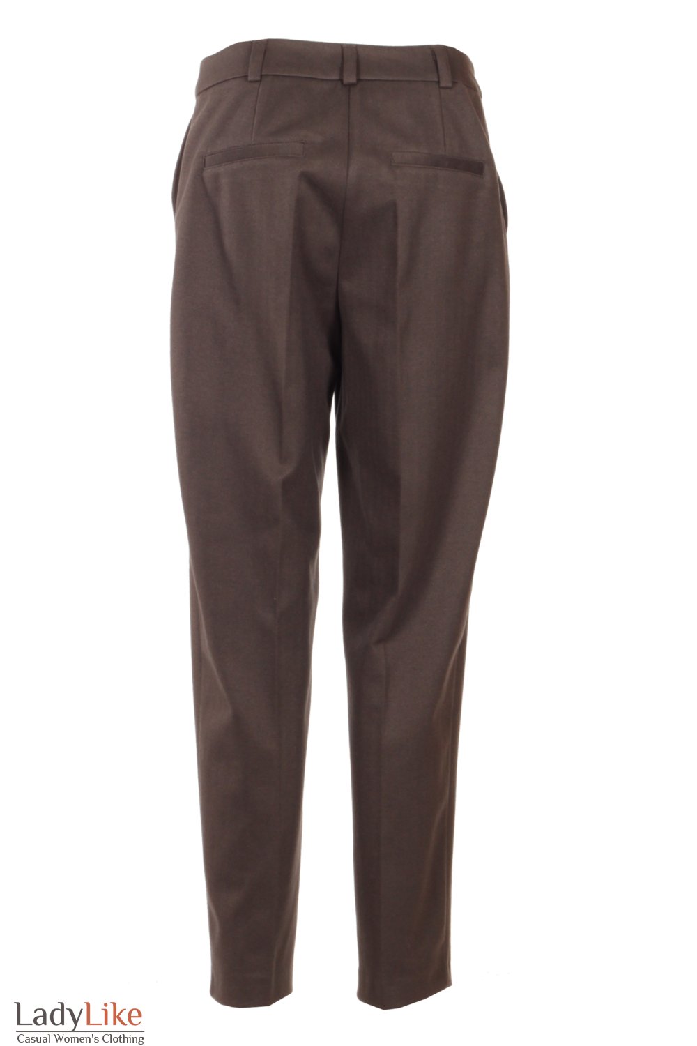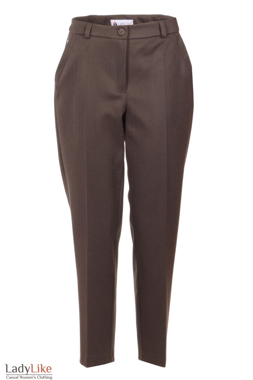 Брюки теплые цвета мокко. Прямые, слегка зауженные к низу. Высокая посадка, застегиваются на молнию и пуговицу. По бокам прорезные карманы, сзади карманы-обманки. На поясе шлевки для ремня. Длина 100 см.