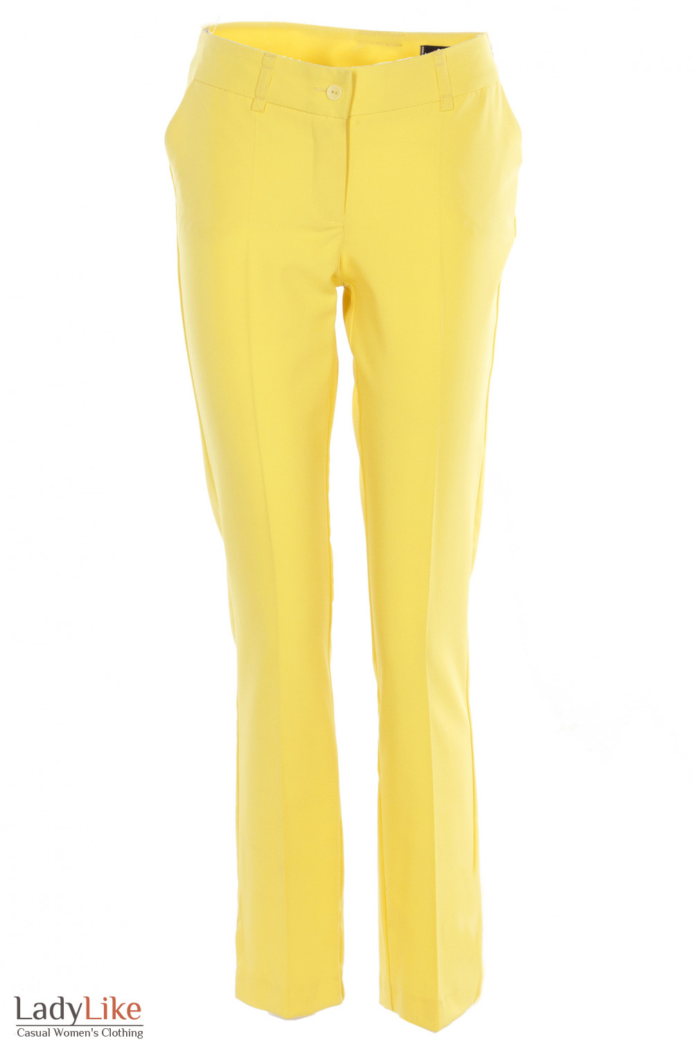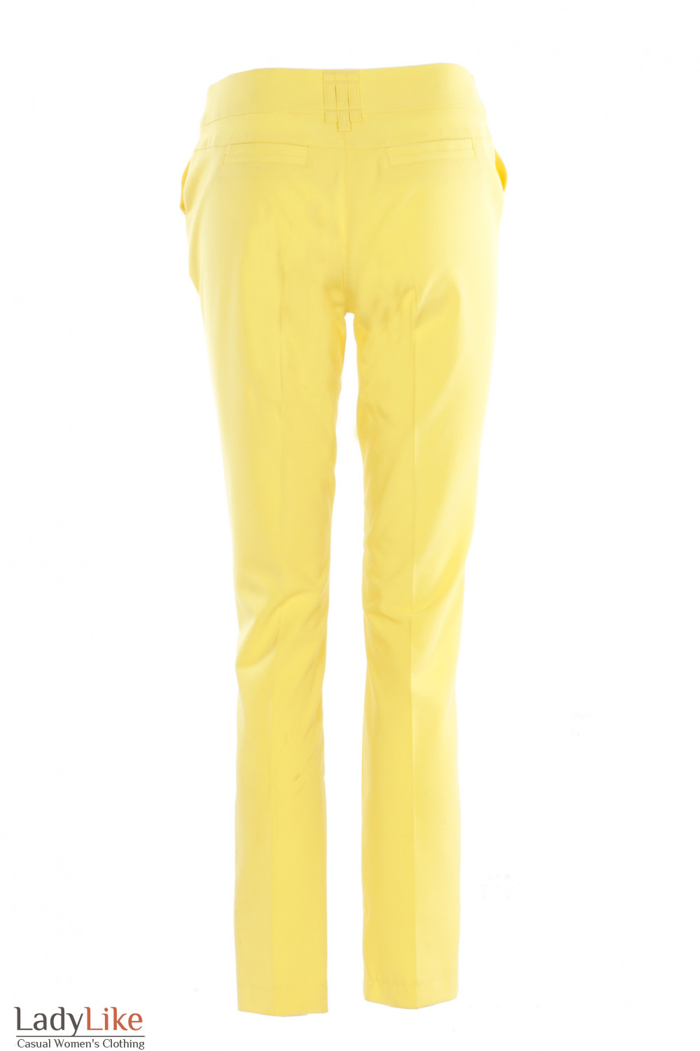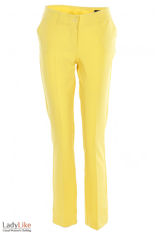 Брюки летние ярко-желтые. Зауженные к низу. Средняя посадка. Боковые карманы. Застежка на молнию, пуговицу с петлей. Длина по внутреннему шву около 80 см.