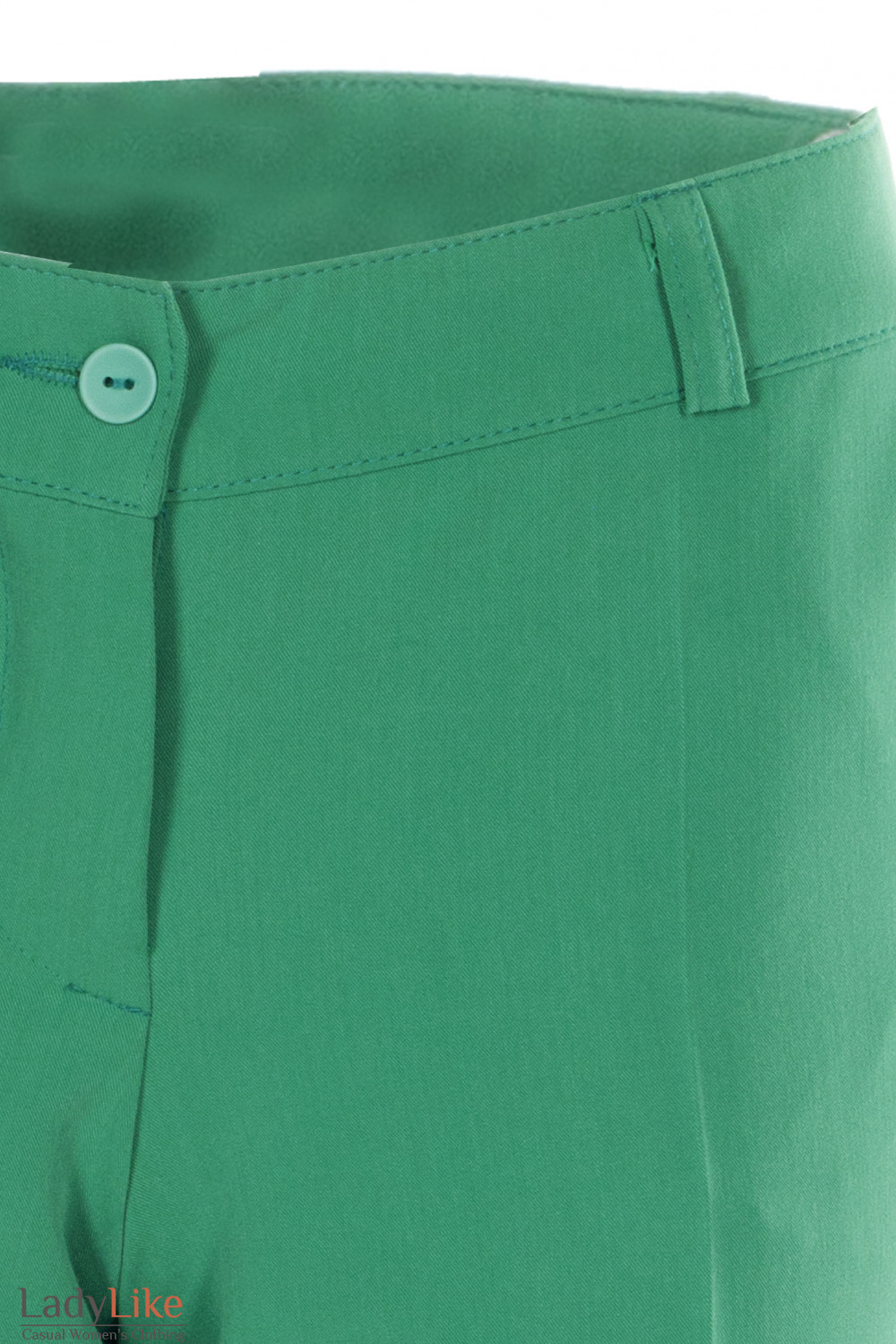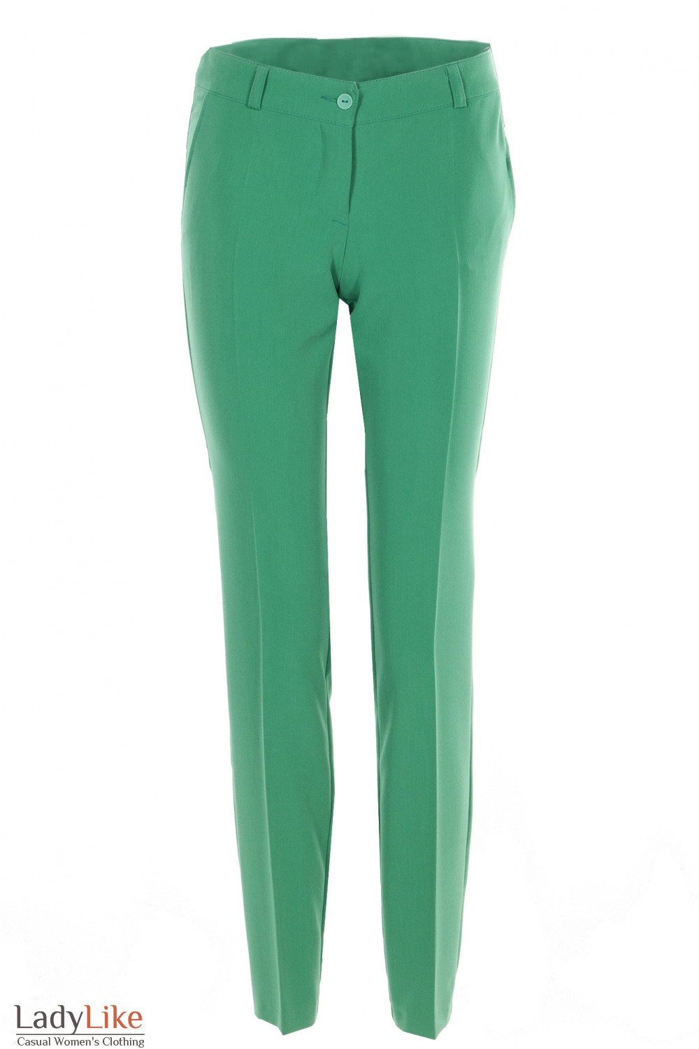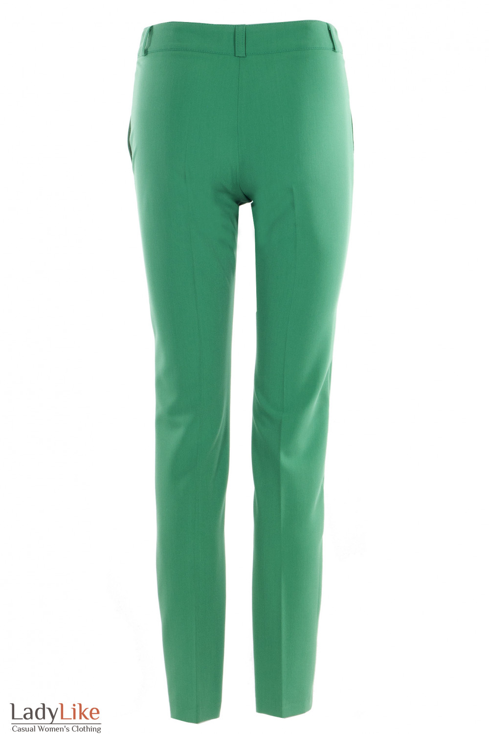 Брюки зеленые средней посадки. Зауженные к низу. Застежка на молнию и пуговицу. Два боковых кармана. Длина по шаговому (внутреннему) шву около 80 см.