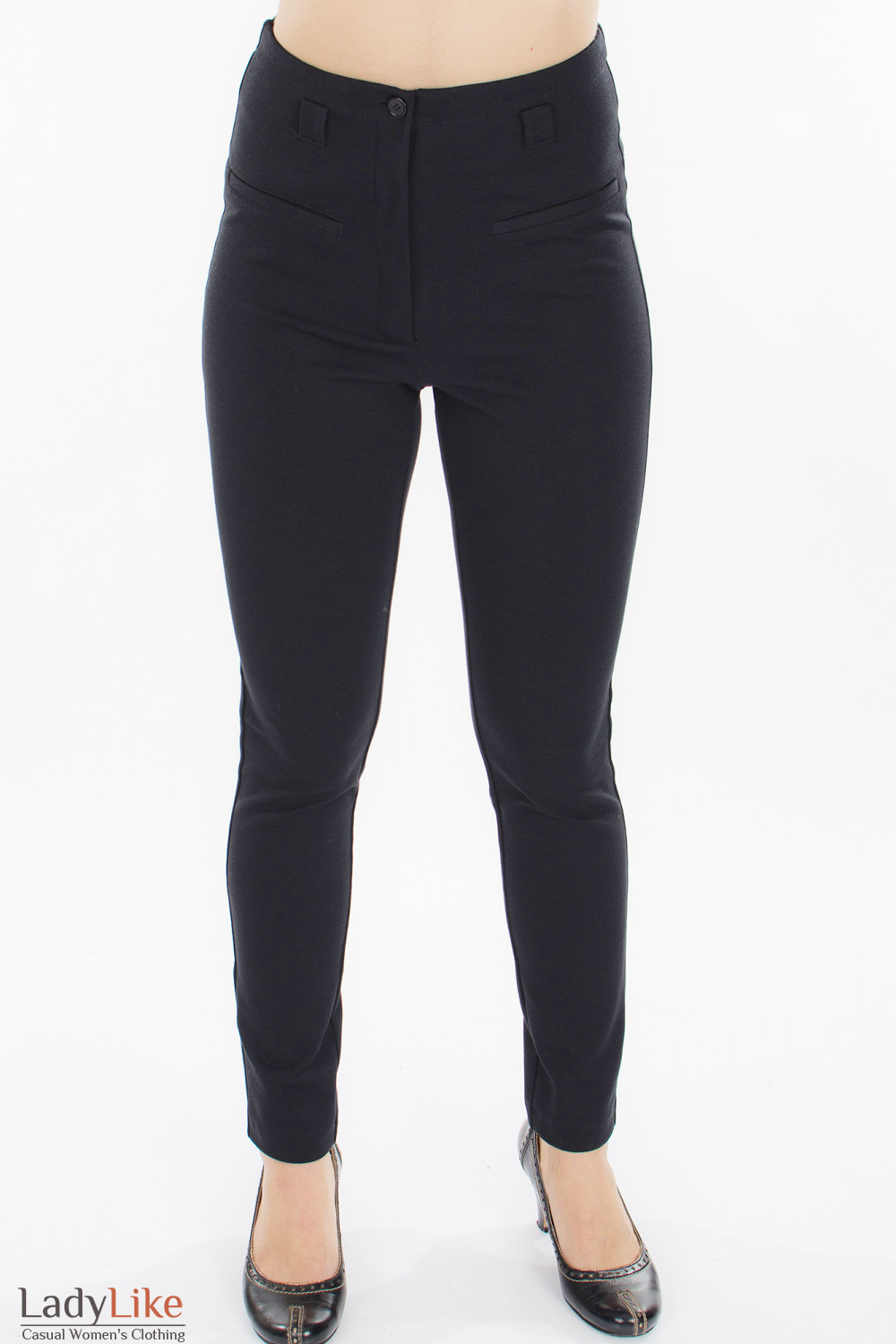 Брюки черные, зауженные к низу, из плотной ткани. Застегивается впереди на пуговицу и молнию. Удобная завышенная посадка в талии. Спереди по бокам 2 прорезных и сзади два накладных кармана-обманки. Длина по внутреннему шву 78 см. Состав: 97% хлопок, 3% эластана.
