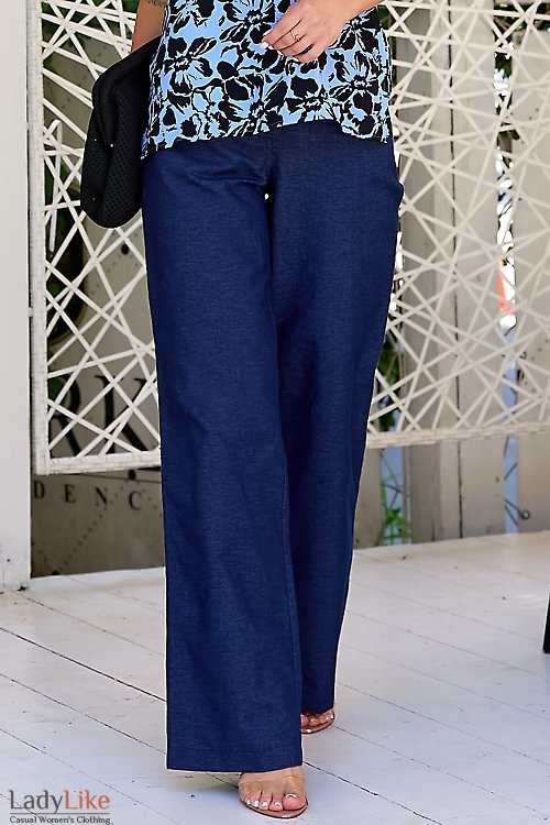 Брюки джинсы синего цвета. Прямые широкие, по бокам карманы, сзади небольшая кокетка и накладные карманы, впереди застегиваются на молнию и пуговицу, пояс втачной со шлевками для ремня. Длина 103 см.