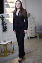 Жакет черного цвета, в стиле Сафари из джинса, с подкладкой. Отложной воротник с лацканами. Однобортный, застегивается на три пуговицы. Впереди и сзади декорирован вставками из основной ткани. Линия талии подчеркнута поясом. Впереди два накладных кармана с клапанами, застегиваються на одну пуговицу. Брюки широкие, из джинса. Пояс втачной на резинке с кулиской. Впереди гульфик обманка, по бокам прорезные карманы. Сзади два накладных кармана.