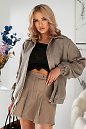 Бежевый меланжевый бомбер с отложным воротником – это идеальный выбор для тех, кто ценит комфорт и стиль. Карманы-листочки и кокетка на полочке и спинке придают образу женственности, а мягкая резинка по низу и манжетам обеспечивает безупречную посадку. Юбка из мягкой меланжевой ткани со складками мини бежевого цвета застегивается на молнию и пуговицу.