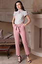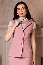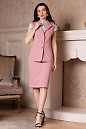 Стильный женский жилет нежно-розового цвета, на подкладке. Приталенный и удлиненный крой, однобортный с отложним лацканом, застегивается на две пуговицы. По бокам карманы-обманки. Длина 65см. Юбка-карандаш нежно-розового цвета, на подкладке. Сзади юбка со шлицей, застегивается на потайную молнию. Длина 65см. Брюки укороченные, завышенная посадка на талии. По бокам прорезные карманы. На поясе шлевки для ремня. В комплекте пояс из основной ткани.