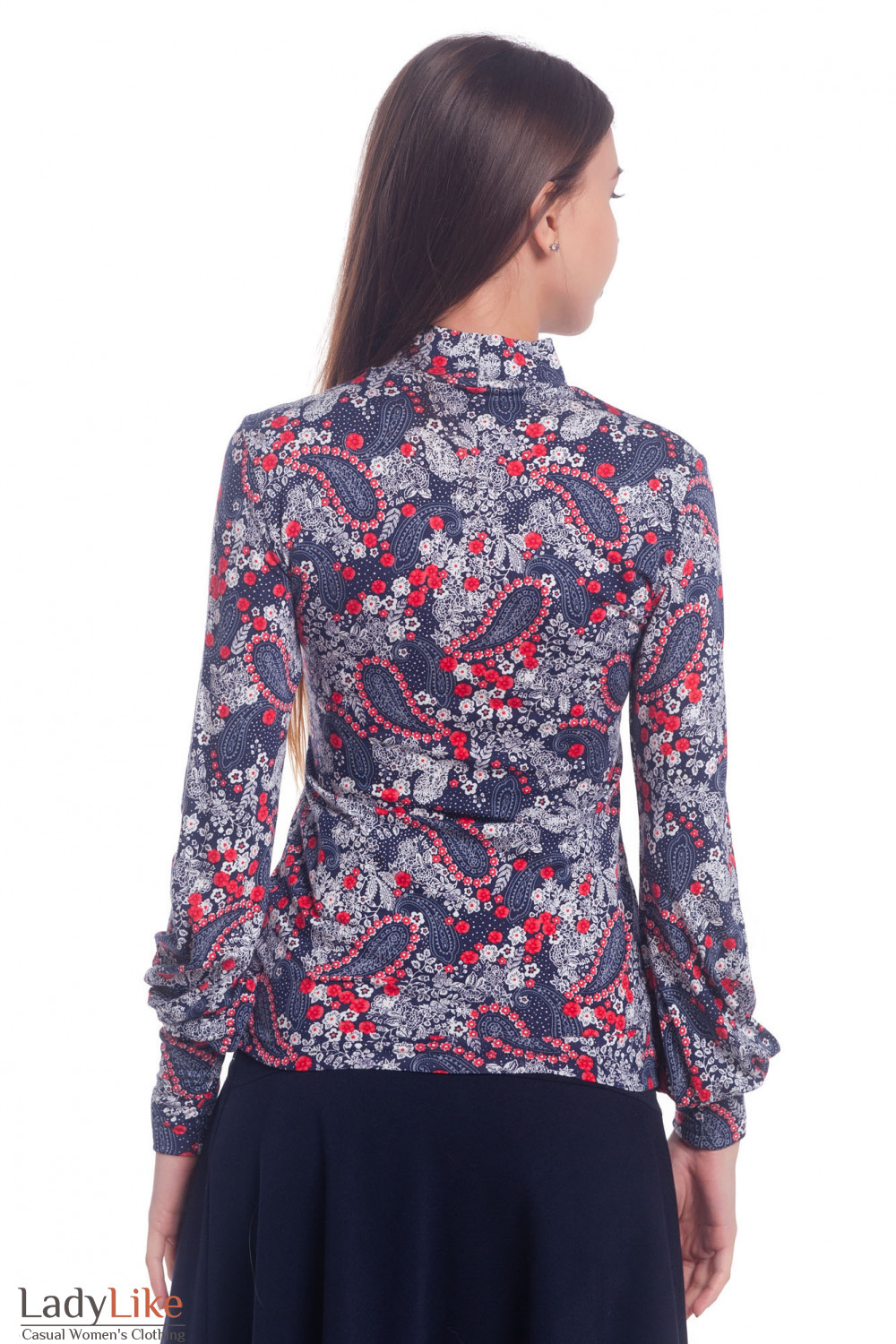 Синий гольф в мелкий цветочек с длинным рукавом и воротником стойкой. Сильно облегающий крой. Рукав с широкой манжетой. Длина ок. 62 см.