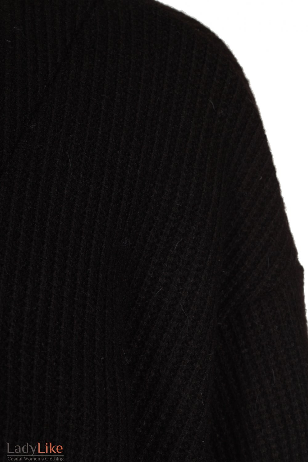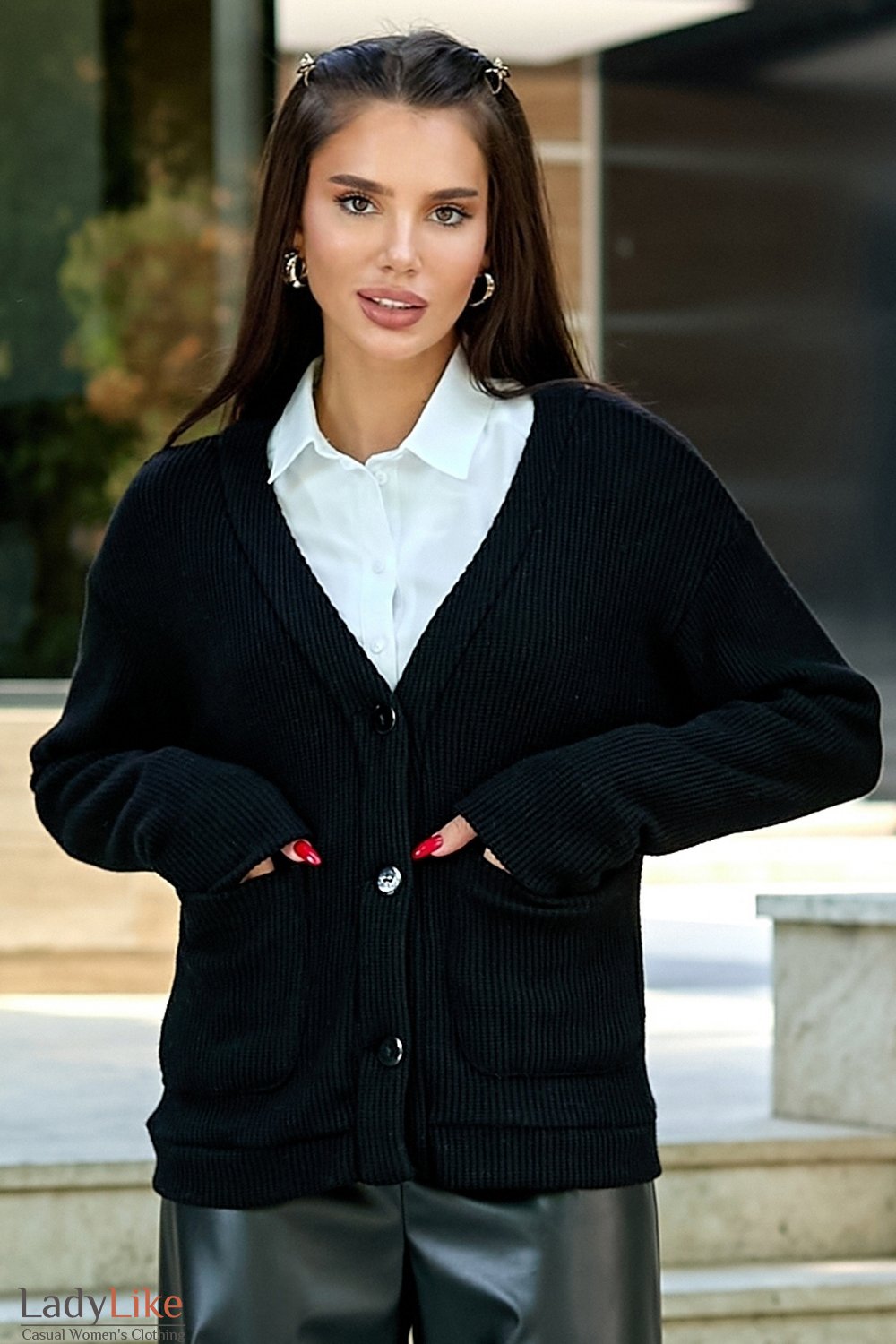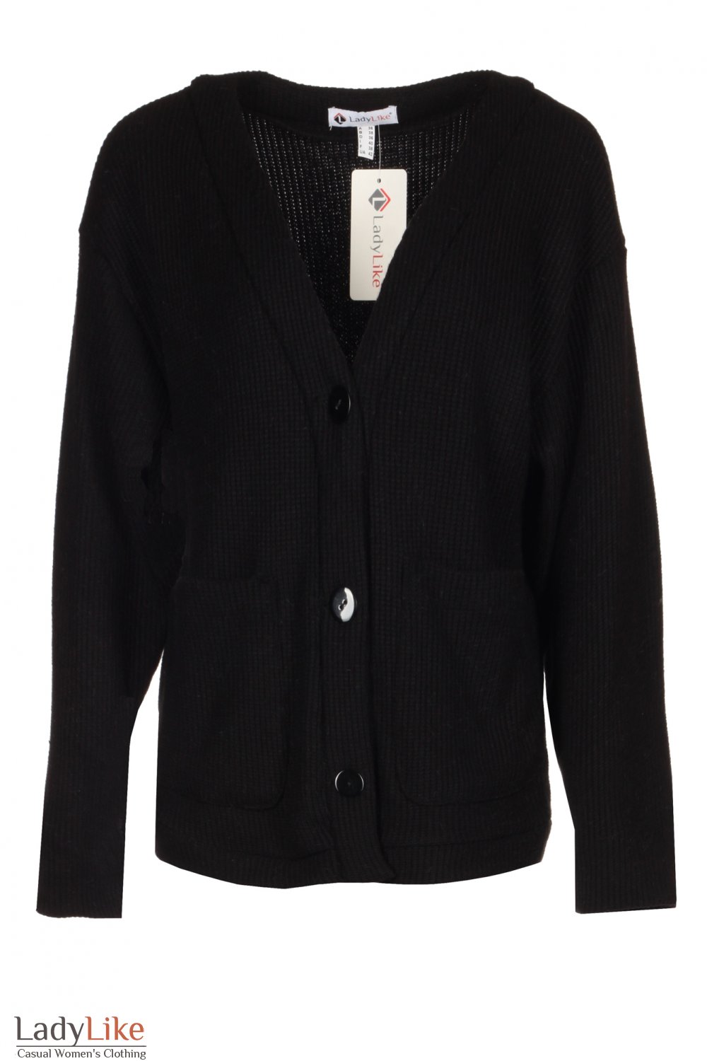 Кофта вязаная теплая, черного цвета. Прямого кроя, V-вырез горловины, застегивается на три пуговицы. Рукава длинные. Впереди накладные карманы. Длина 68 см.