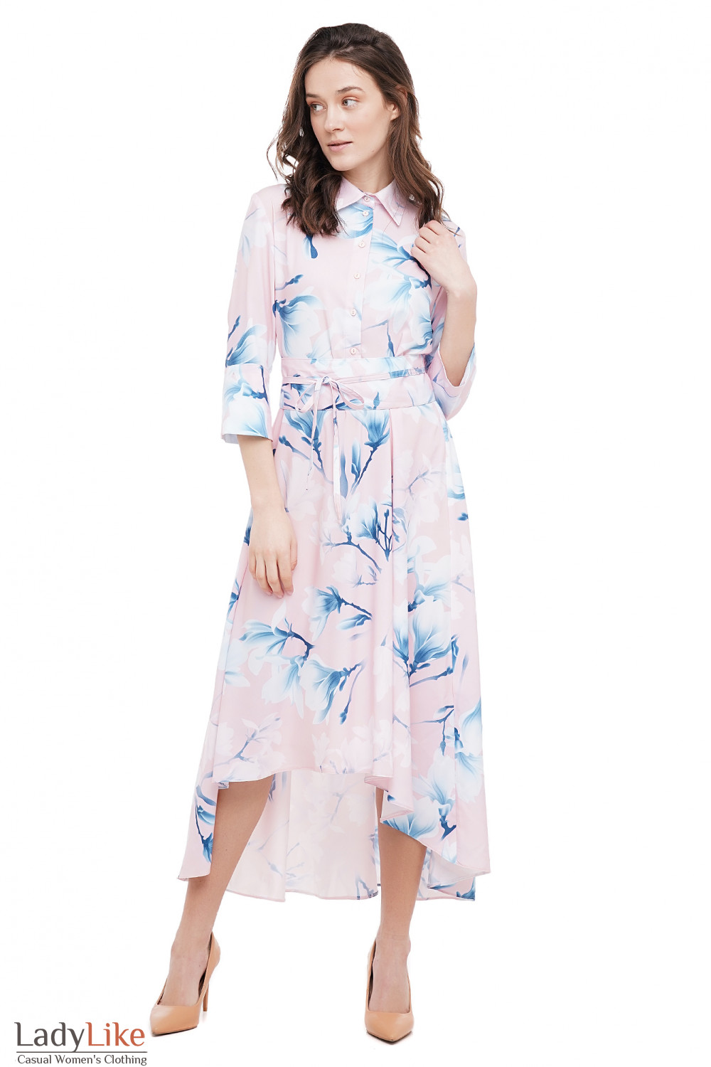 Летнее нарядное платье из легкого софта. Элегантная пышная юбка в складку. Платье с асимметричным низом. Рукав длиной в три четверти с широкой манжетой. В комплекте пояс. Длина платья по спинке около 110 см.