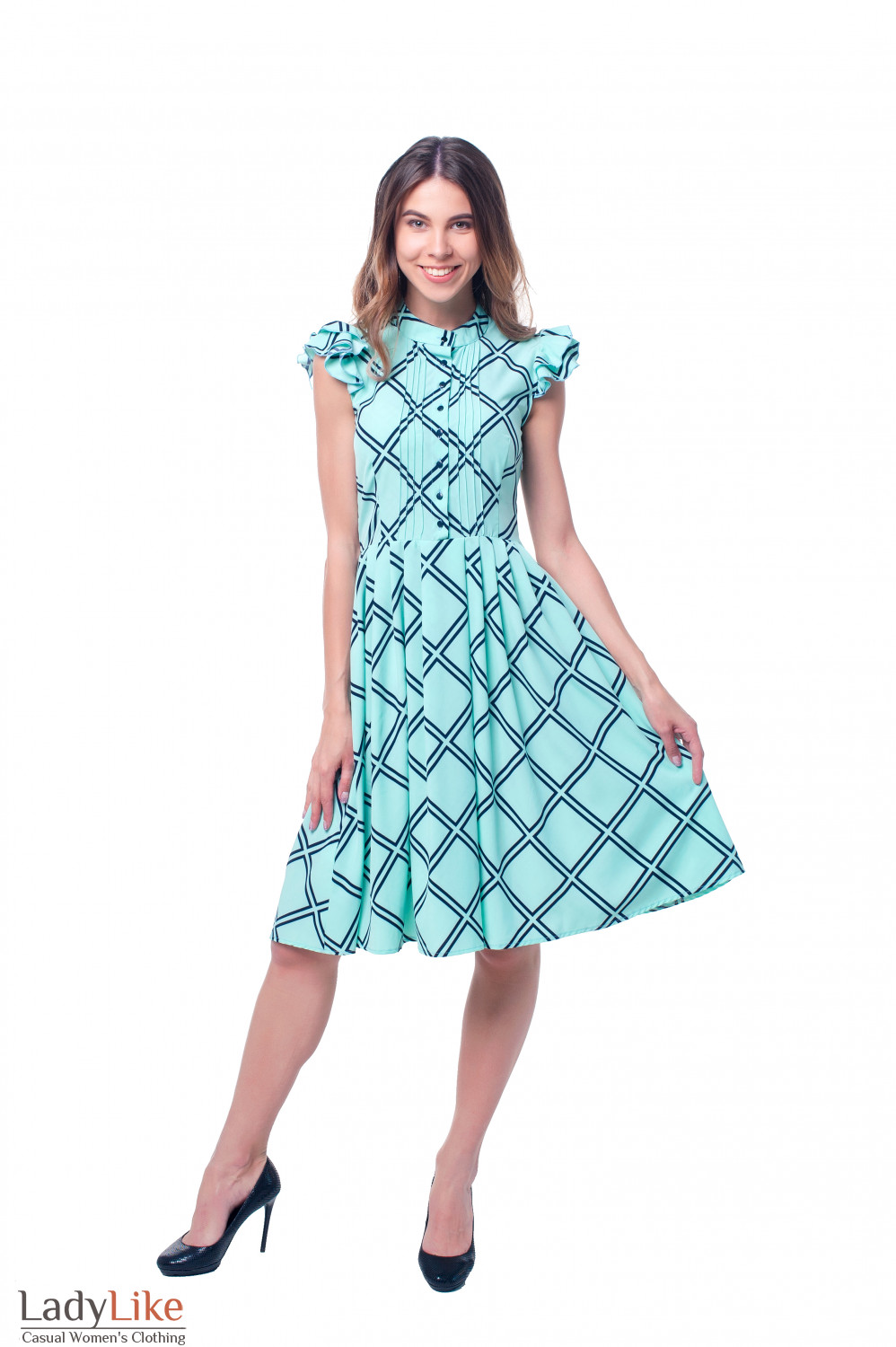 Летнее бирюзовое платье в крупную черную клетку. Впереди платье украшено защипами и планкой с пуговицами. Короткий двойной рукавчики, воротник-стойка, пышная юбка в складку. Платье без подкладки, застегивается на молнию сбоку. Длина ок. 95 см.