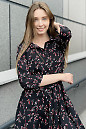 Платье в цветочный принт, черное в бело-красные веточки. Отложной воротник, впереди застегивается на пуговицы. Рукава три четверти с тонкой манжетой на одну пуговицу. Отрезная талия подчеркнута пояском из основной ткани.