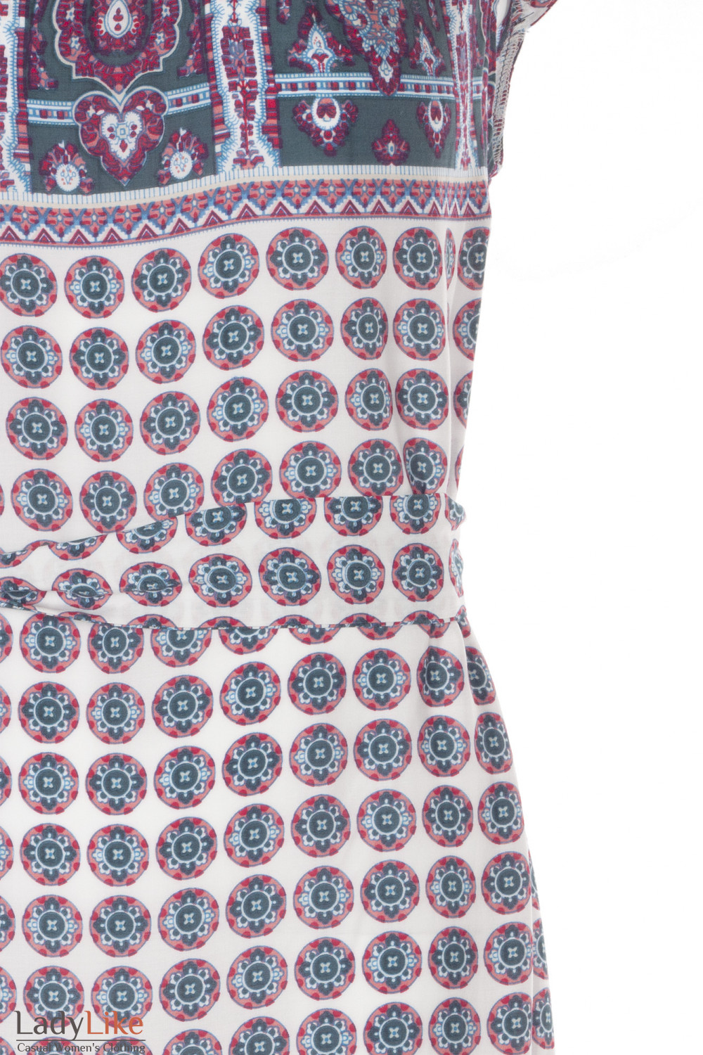 Легкое платье из хлопка. Короткий рукав. Защипы по горловине. В комплекте пояс из основной ткани. Застежка по спинке у горловины на пуговицу и воздушную петлю. Сбоку высокий разрез. Длина около 170 см.
