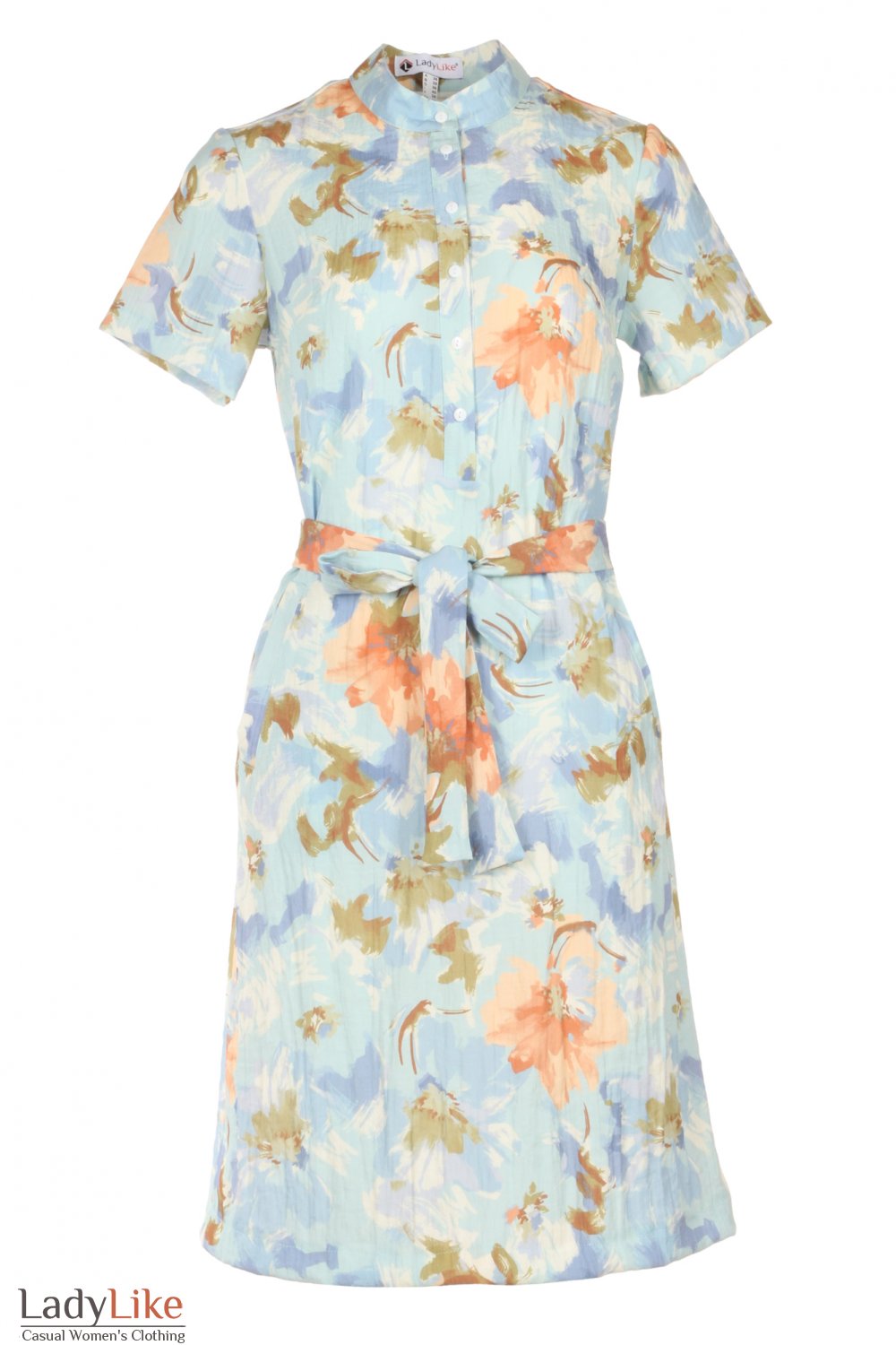 Платье в цветочный принт в стиле батик, голубого цвета. Прямое, воротник стойка, впереди до талии застегивается на пуговицы. Рукава короткие, на талии платье завязывается на поясок из основной ткани. Длина 90 см.