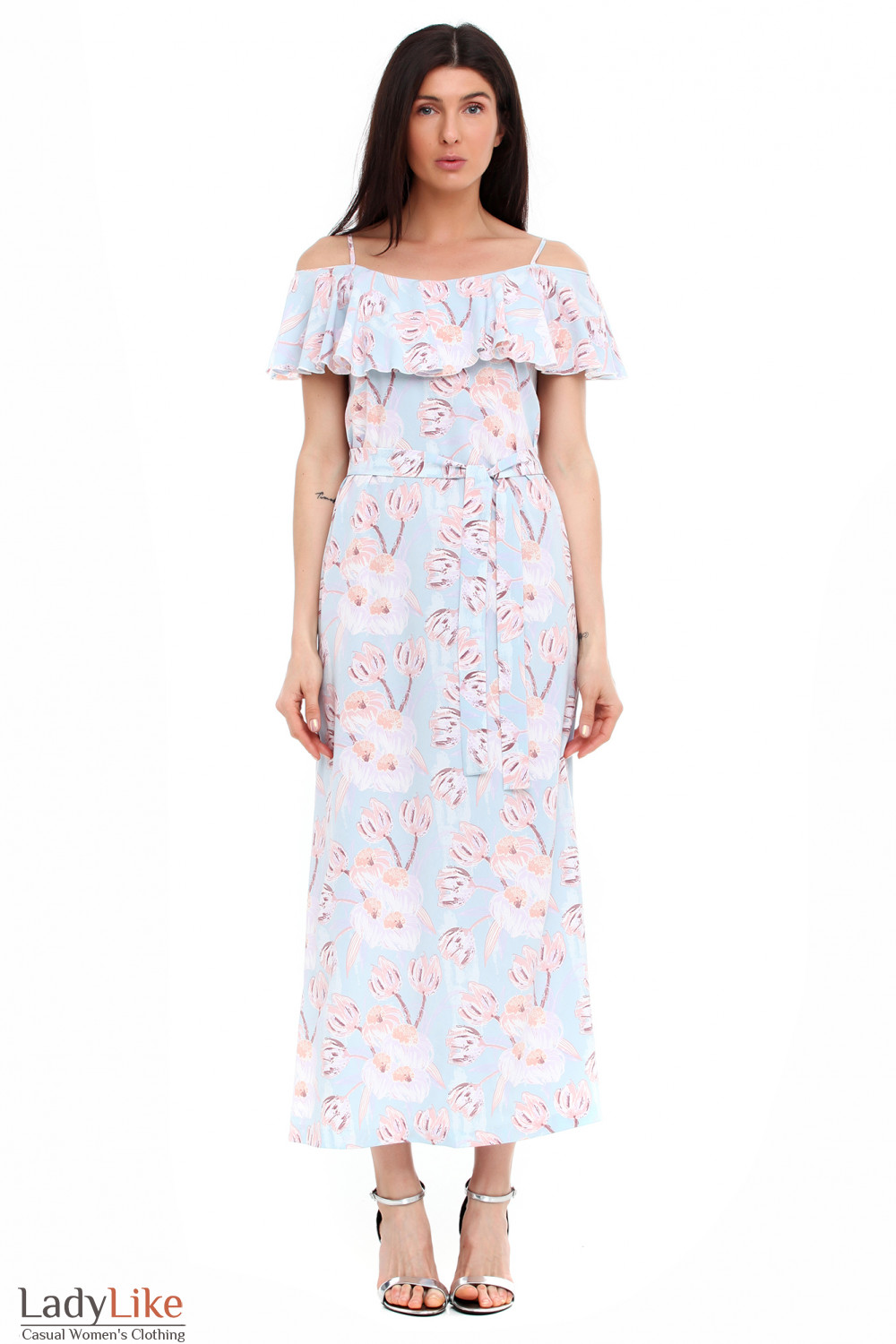 Легкое летнее платье в пол. Европейский фасон - прямой, просторный. Цвет платья - нежно-голубая в белые цветы. Модель украшена широким воланом и тонкими бретелями. Дополняет платье тонкий поясок, который еще больше подчеркнет идеальность фигуры.