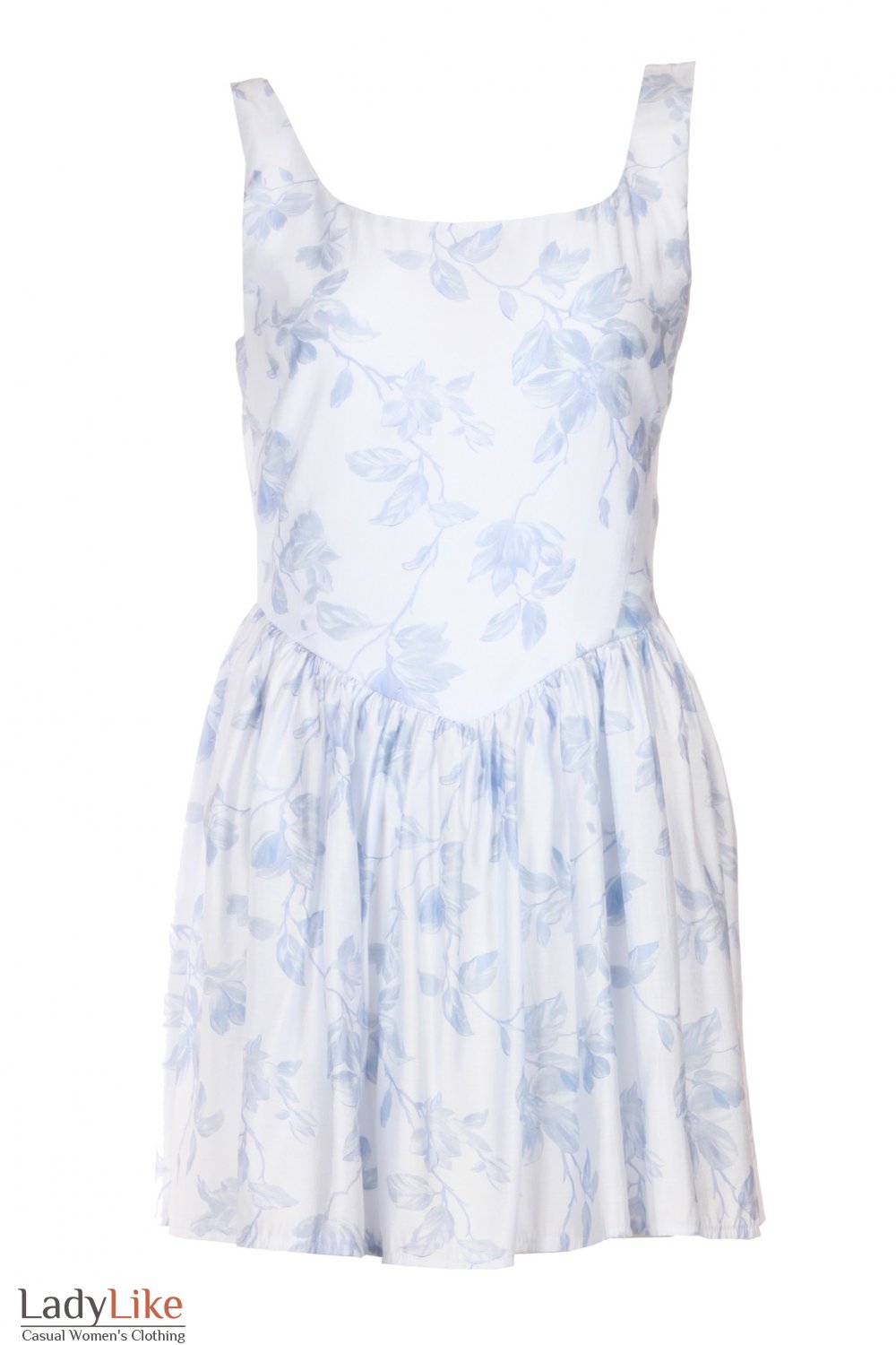 Платье мини нежно голубого цвета в голубые цветы. Круглый вырез горловины. Приталенное с пышной юбкой. Сбоку застегивается на молнию. Спинка и полочка до талии на подкладке. Длина платья около 80 см.