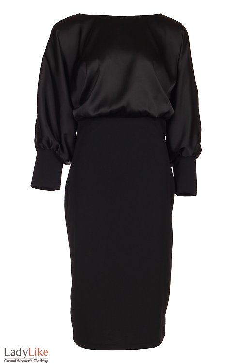 Платье миди, в комбинации двух тканей черного цвета. Верх блузки легкий шелк, отрезная талия, юбка узкая трикотаж. Круглый вырез горловины. Рукава длинные пышные, цельнокроеные с широкой манжетой. Длина 115 см.
