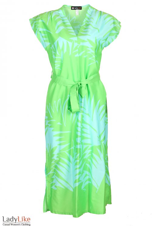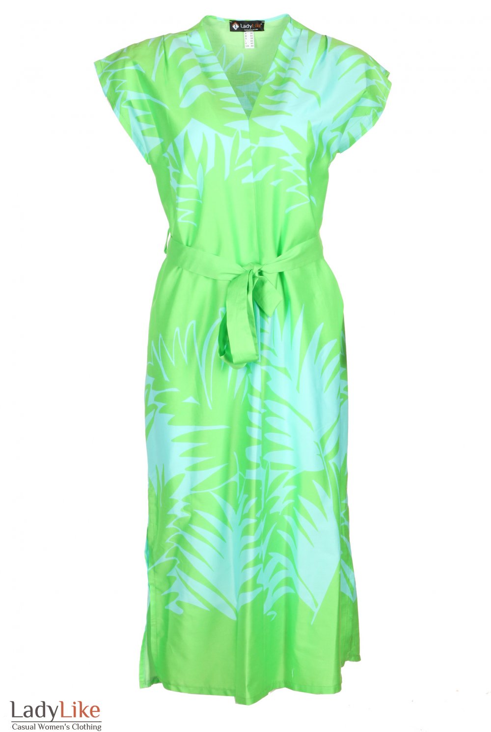 Платье летнее хлопковое. Прямого кроя, с поясом. V-вырез горловины, на плече небольшие складочки. По бокам разрезы. Длина миди 112 см.