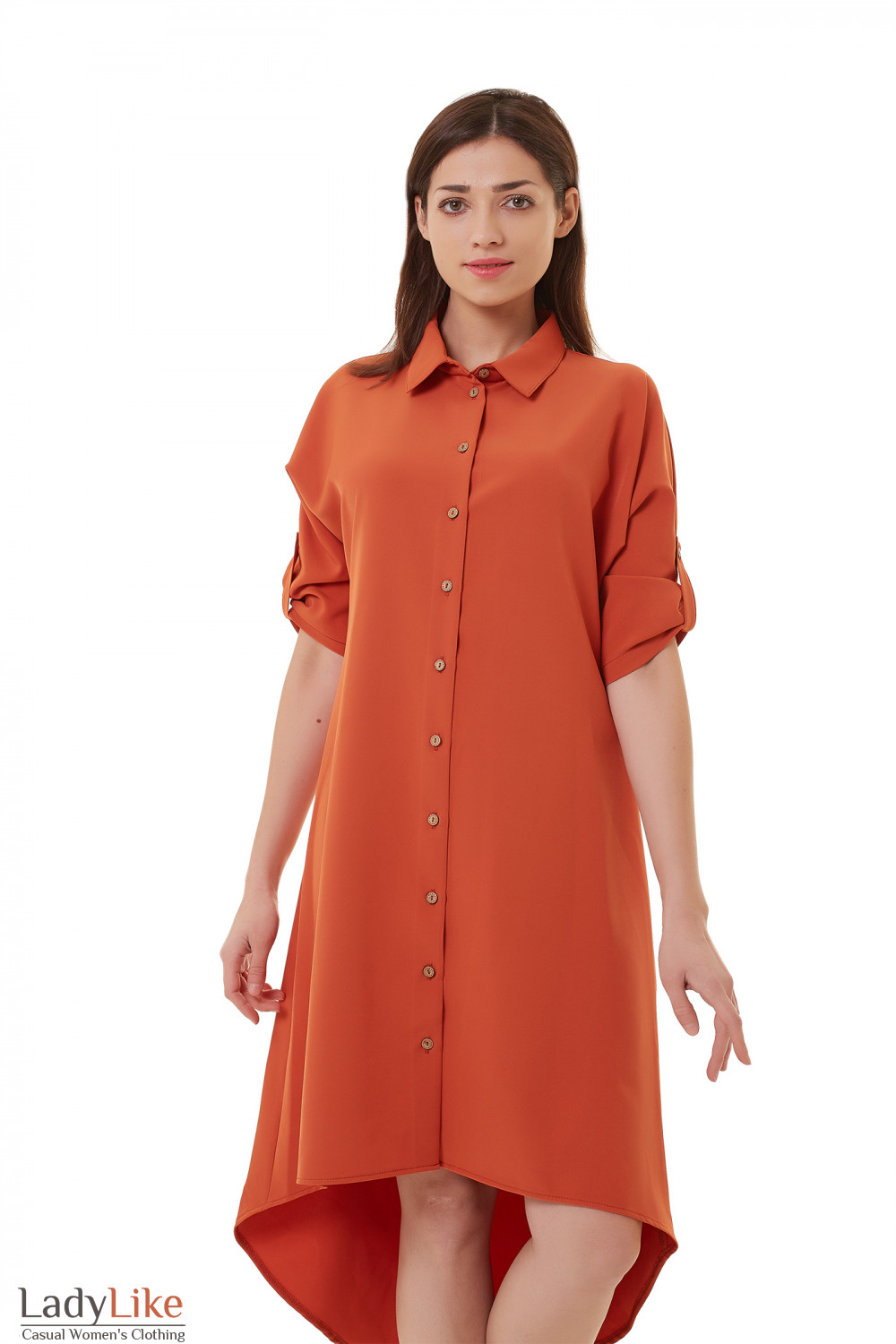 Платье-сафари насыщеного терракотового цвета. Просторный крой, без подкладки. Воротник стояче-отложной. Рукав длиной в три четверти с патой на пуговичке. Застегивается впереди на пуговицы. Очень стильно смотрится с широким поясом. Длина ок. 115 см.