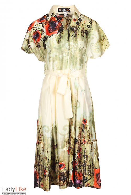 Стильное платье просторного кроя в яркие цветы. Юбка в складку. Пояс из основной ткани идеально подчеркивает талию. V-образный вырез горловины. По бокам добавлены карманы. Длина около 105 см.