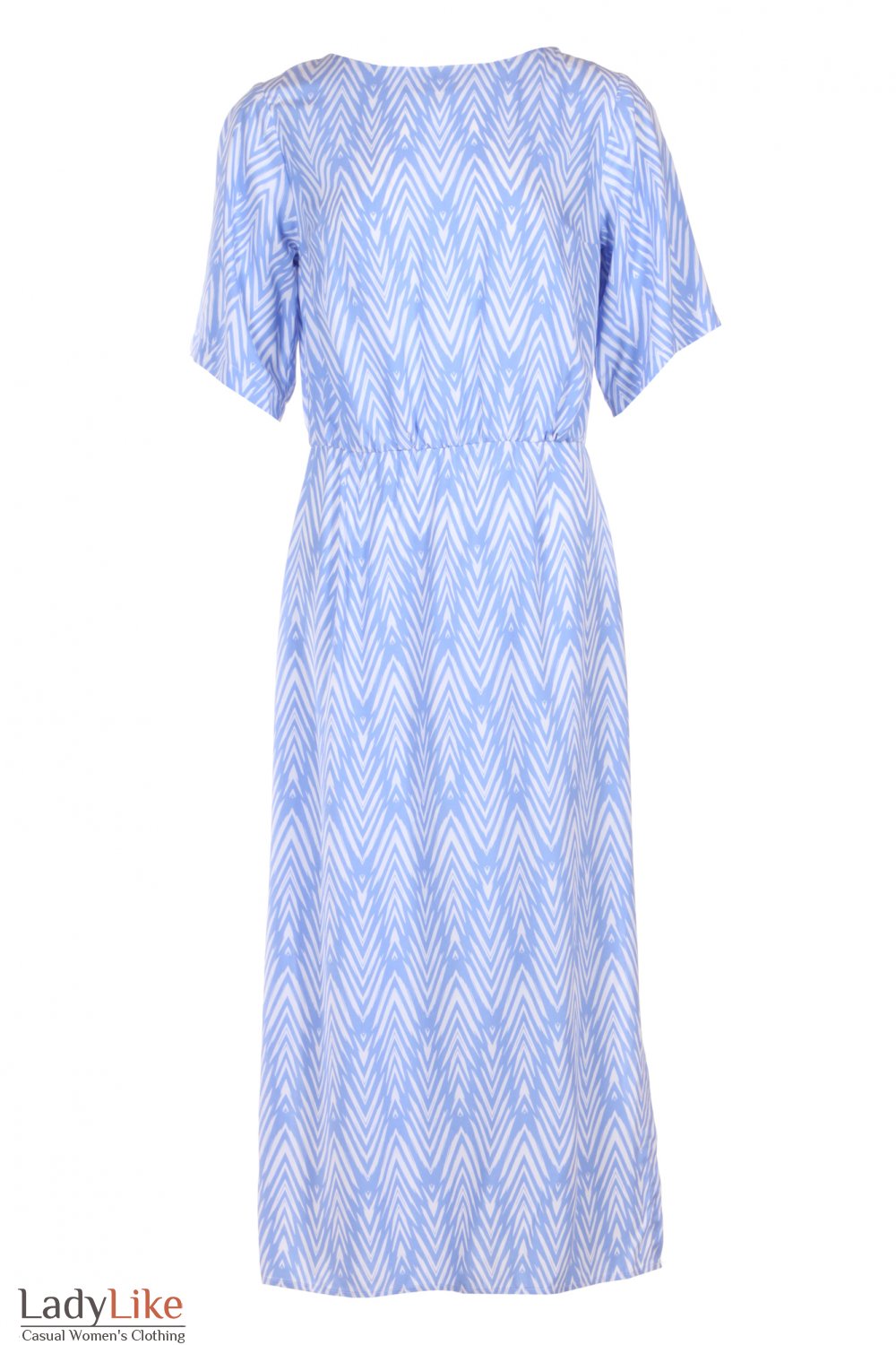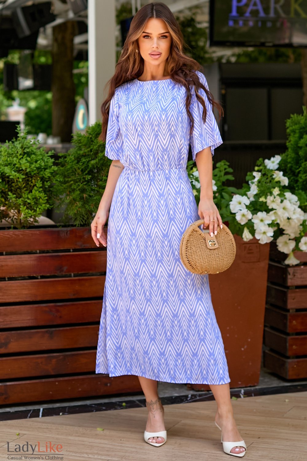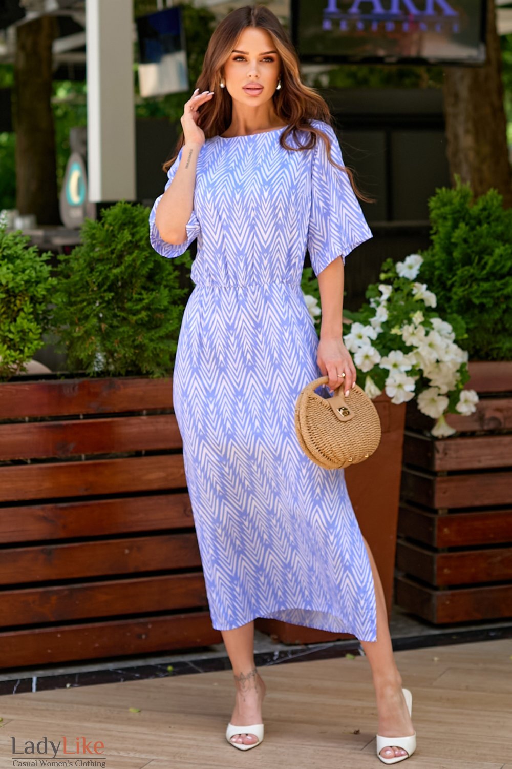 Платье миди, принт зигзаг бело-голубого цвета. Прямое просторное, на талии вставлена резинка, по бокам небольшие разрезы. Рукава короткие, сзади застегивается на молнию. Длина 124 см.