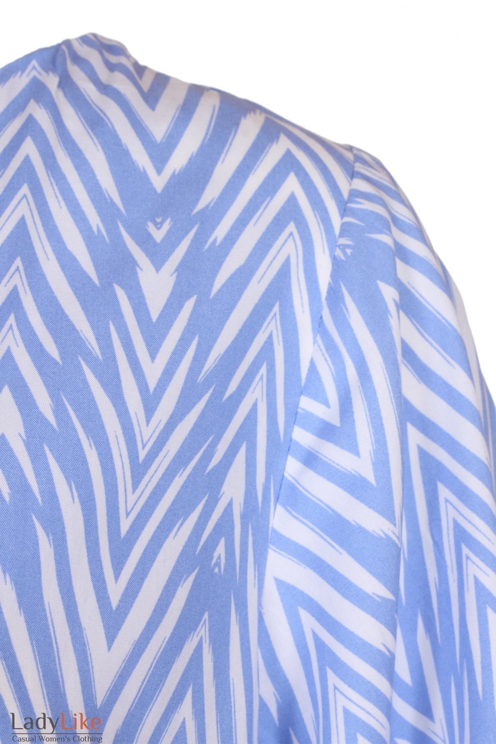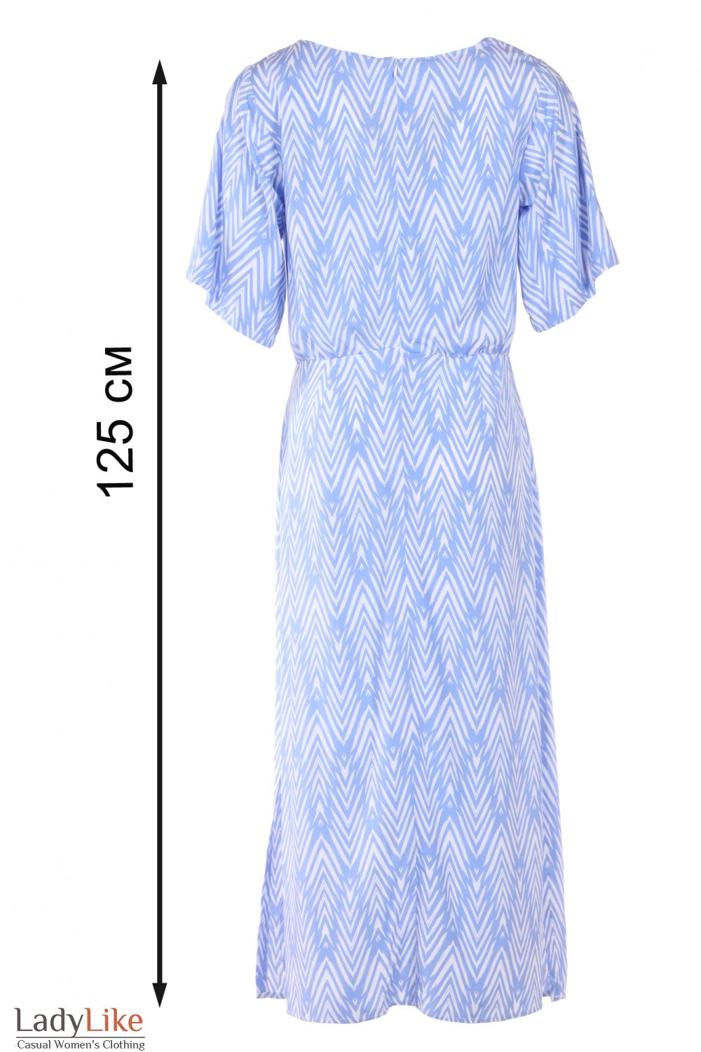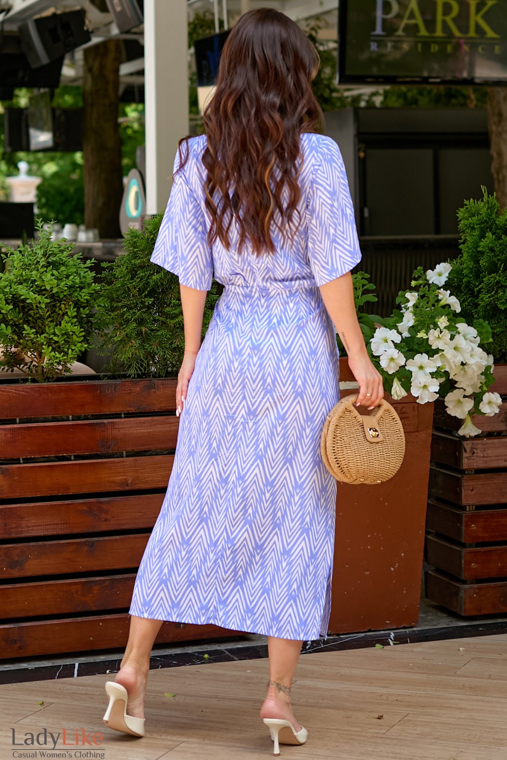 Платье миди, принт зигзаг бело-голубого цвета. Прямое просторное, на талии вставлена резинка, по бокам небольшие разрезы. Рукава короткие, сзади застегивается на молнию. Длина 124 см.