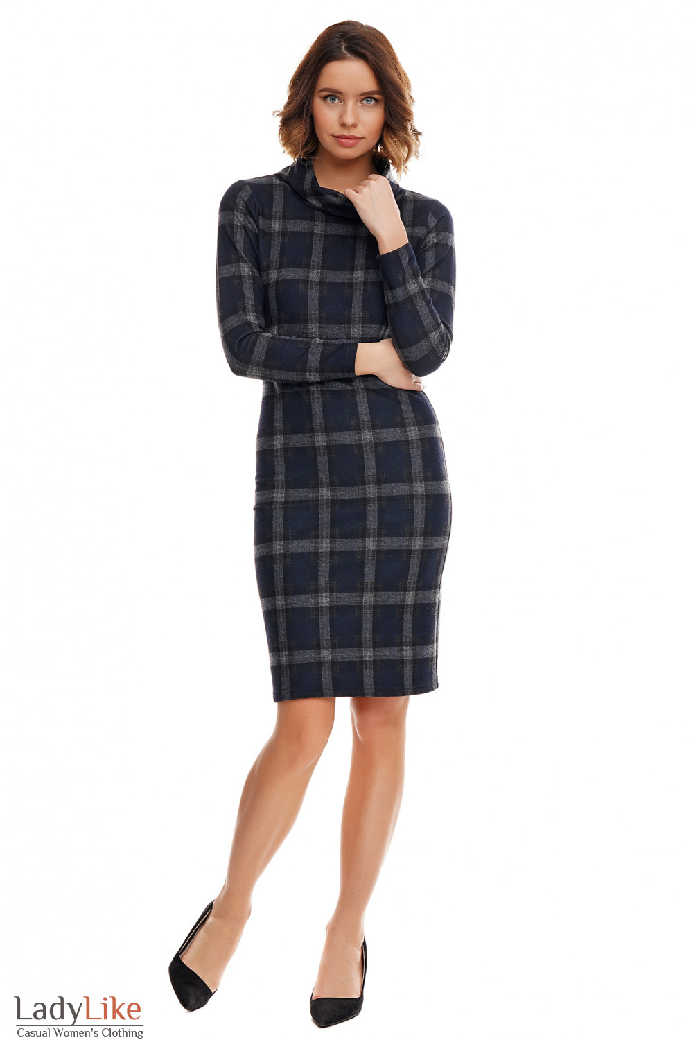 Платье футляр в синюю крупную клетку. Высокий ворот-хомут, длинный рукав. Платье очень тёплое, на флисе.