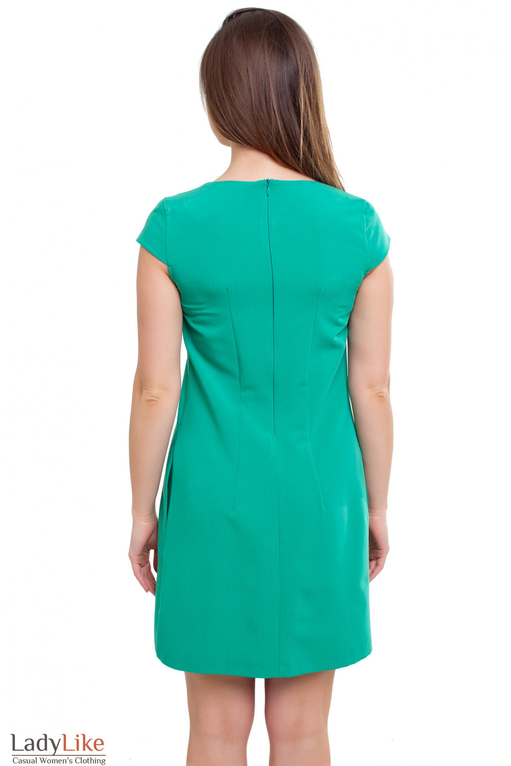 Платье-трапеция зеленое. На груди складочка бантовая. Фигурный вырез горловины. Короткий рукав. Застежка на молнию по спинке. По бокам карманы. Длина около 75 см.