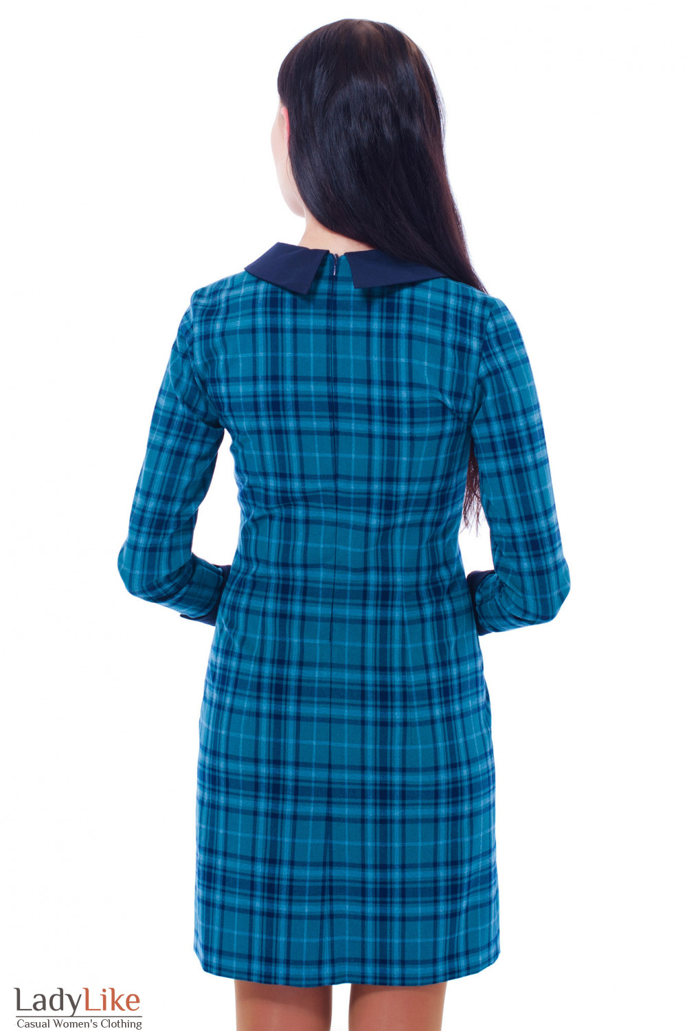 Платье в зеленую клетку. Приталенный силуэт. Длинный рукав с контрасной манжетой. По спинке молния. Круглый вырез горловины украшен воротником из синего атласа. Длина ок. 78 см. В размерах 40 и 42 платье длиннее на 10 см.