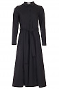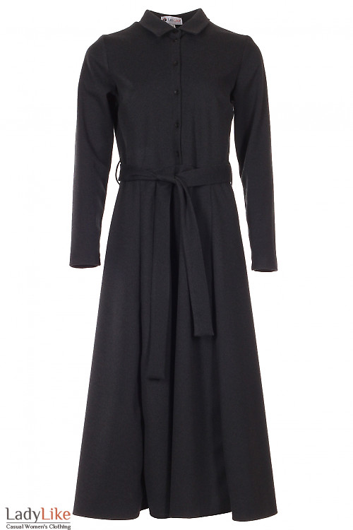 Теплое шерстяное платье с поясом, серого цвета в галочку. Приталенный верх, впереди застегивается на 6 пуговиц. Отрезная талия, юбка пышная клиньями. Рукава длинные, воротник стояче-отложной. Длина 118 см.