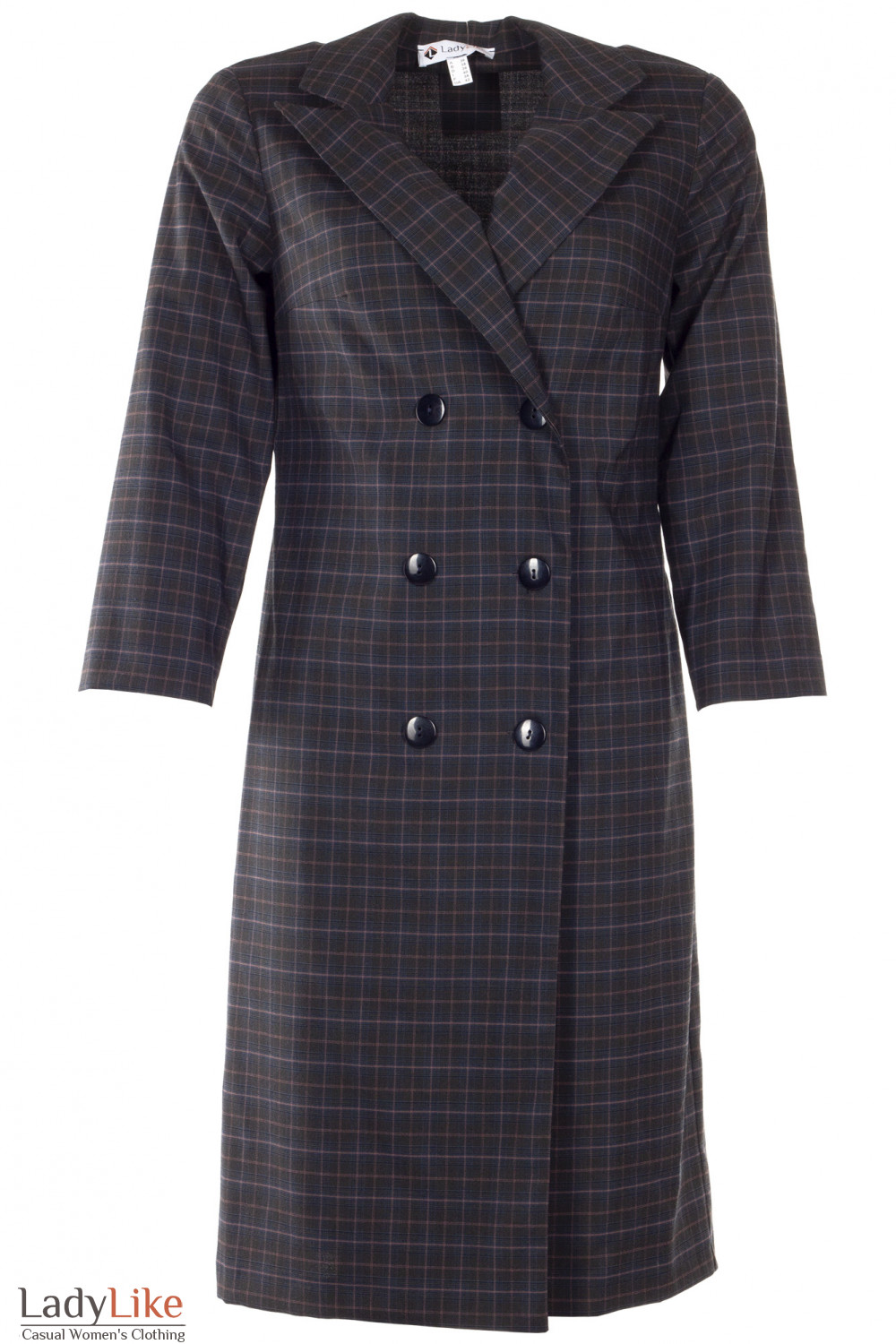 Приталенное, двубортное платье-жакет с поясом, темно-синее в клетку. Отложной воротник с заостренными лацканами, застегивается на одну пуговицу с внутренней стороны. Впереди застегивается на три функциональные пуговицы, и три добавлены как декоративные. Рукава три четверти.