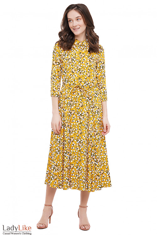 Хлопковое платье в цветочный принт. Застежка впереди на пуговицы до талии. Стояче-отложной воротник. Рукав три четверти. Без подкладки. Платье на кулисе. Длина платья около 131 см.