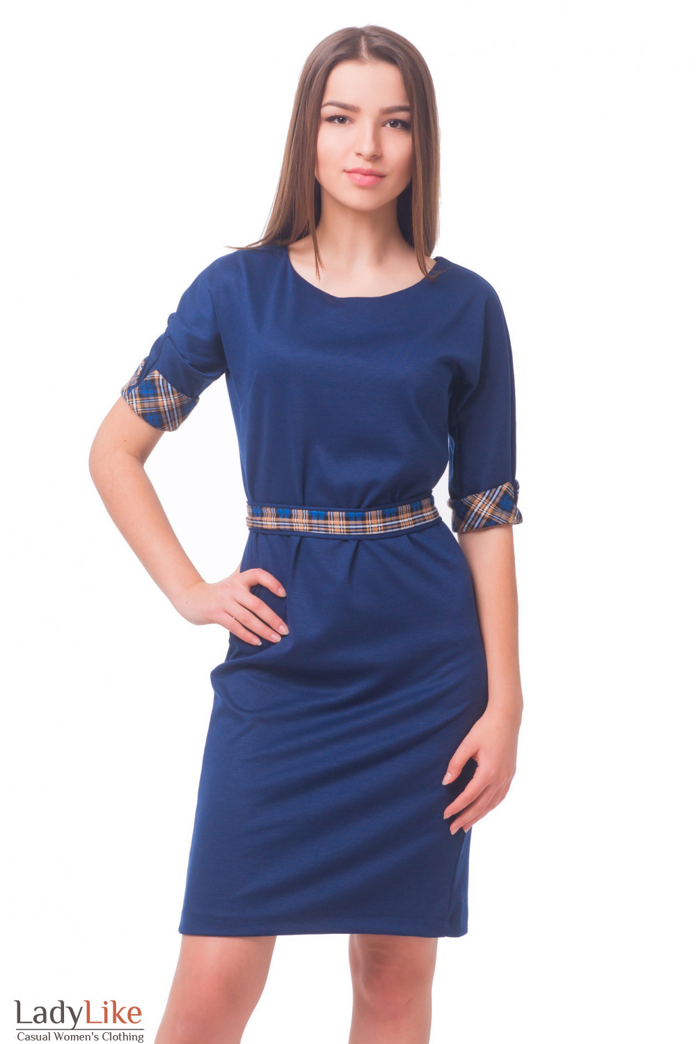 Синее платье с поясом в клетку